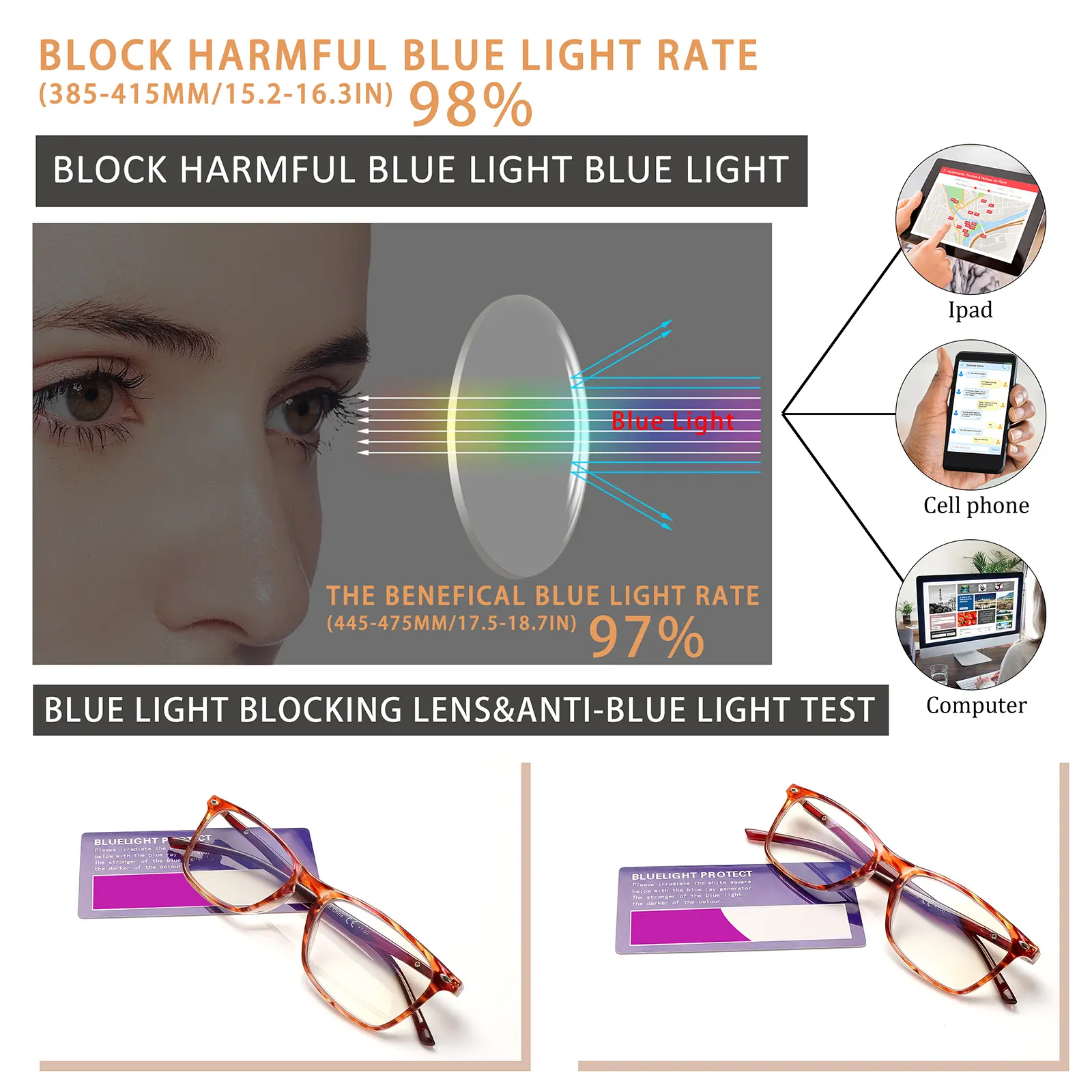 Block Blue Light: Reflect and absorb harmful blue light, block visible high energy blue light, block 85% harmful blue light. Reduces visual fatigue and discomfort when browsing phones, tablets, games and working under fluorescent lights with UV protection and reduces glare