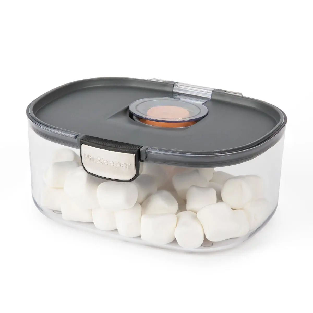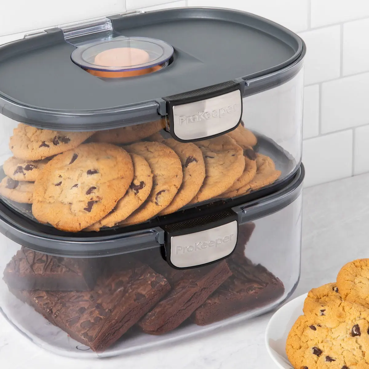Cookie Monster approved! This 3-quart ProKeeper+ Cookie Keeper is perfect for storing its contents fresh for longer. Ideal for desserts or food that easily dry out, such as cookies, brownies, and marshmallows. Designed with an airtight silicone seal and a terracotta disk that stores in the lid, this stackable storage container will keep your favorite treats fresh.