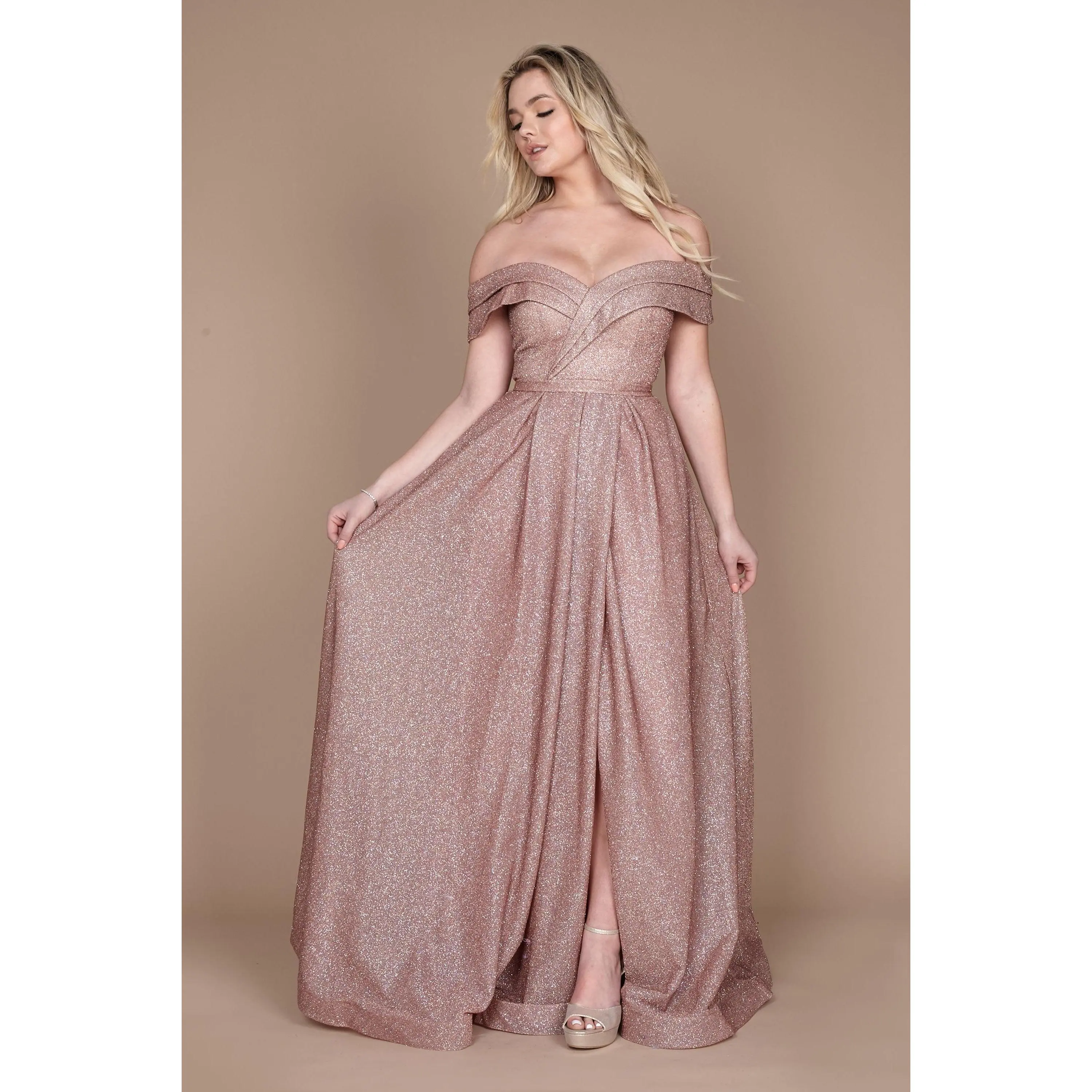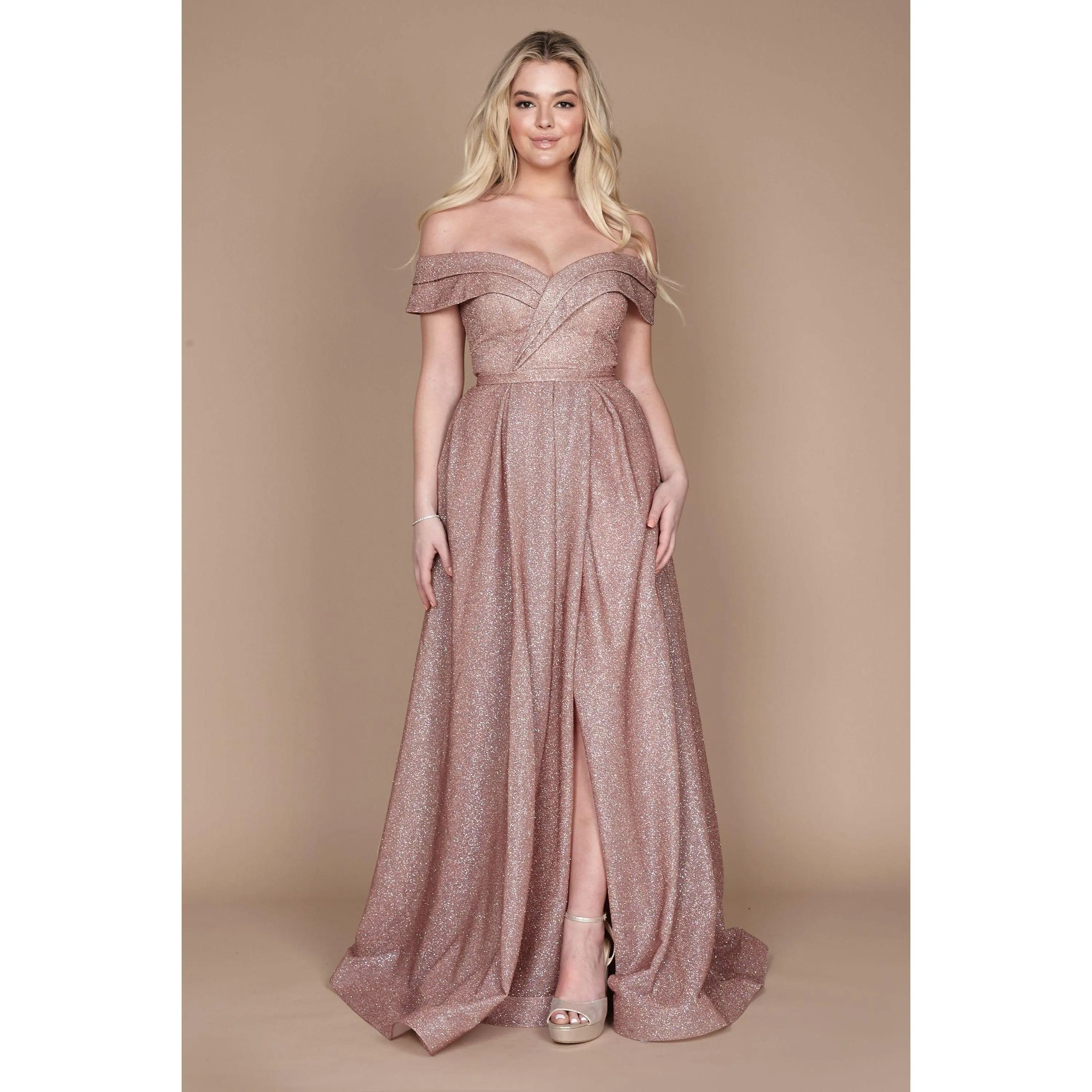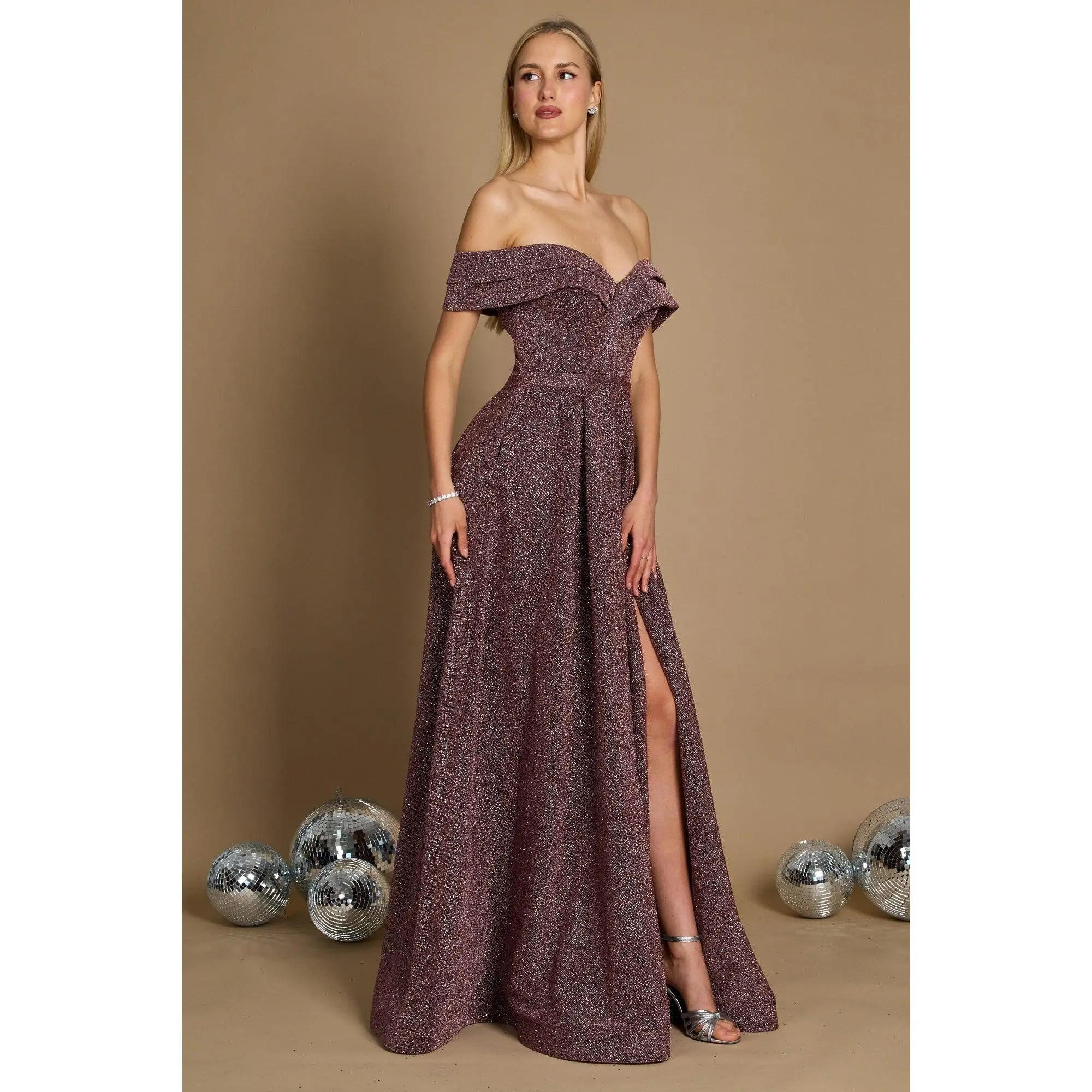 You'll want to wear this elegant formal dress over and over again because of its timeless, straightforward design. The off-shoulder sleeves, sweetheart neckline, side pockets (we know! ), and high front slit on this Dylan & Davids dress are all hallmark features. available in sizes 4 to 24 and in the colors mauve and black. Perfect for formal gatherings like weddings and parties. This dress, which is made of a glittery, shimmering material, will shine brilliantly at any event.