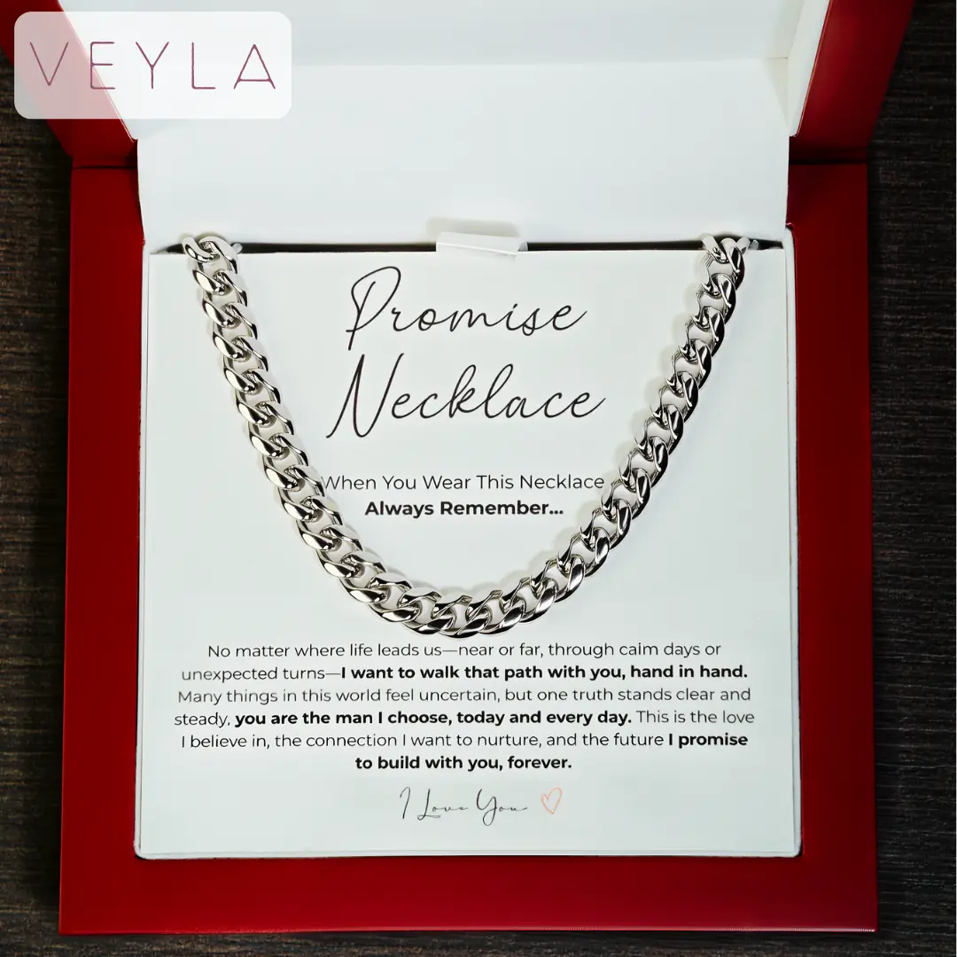 This Promise Necklace features a classic stainless steel Cuban chain, paired with a heartfelt message card. It's a symbol of love, trust, and a shared future.