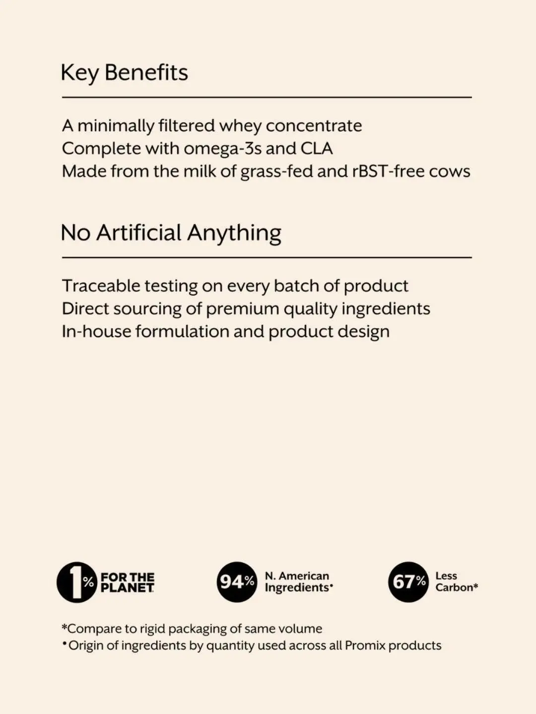 This Promix whey protein powder is crafted from grass-fed milk. It offers a balanced blend of protein and essential amino acids. The minimally filtered process ensures the presence of omega-3s and CLA. The lightly sweetened formula provides a smooth taste. Perfect for those seeking a nutritious protein supplement.