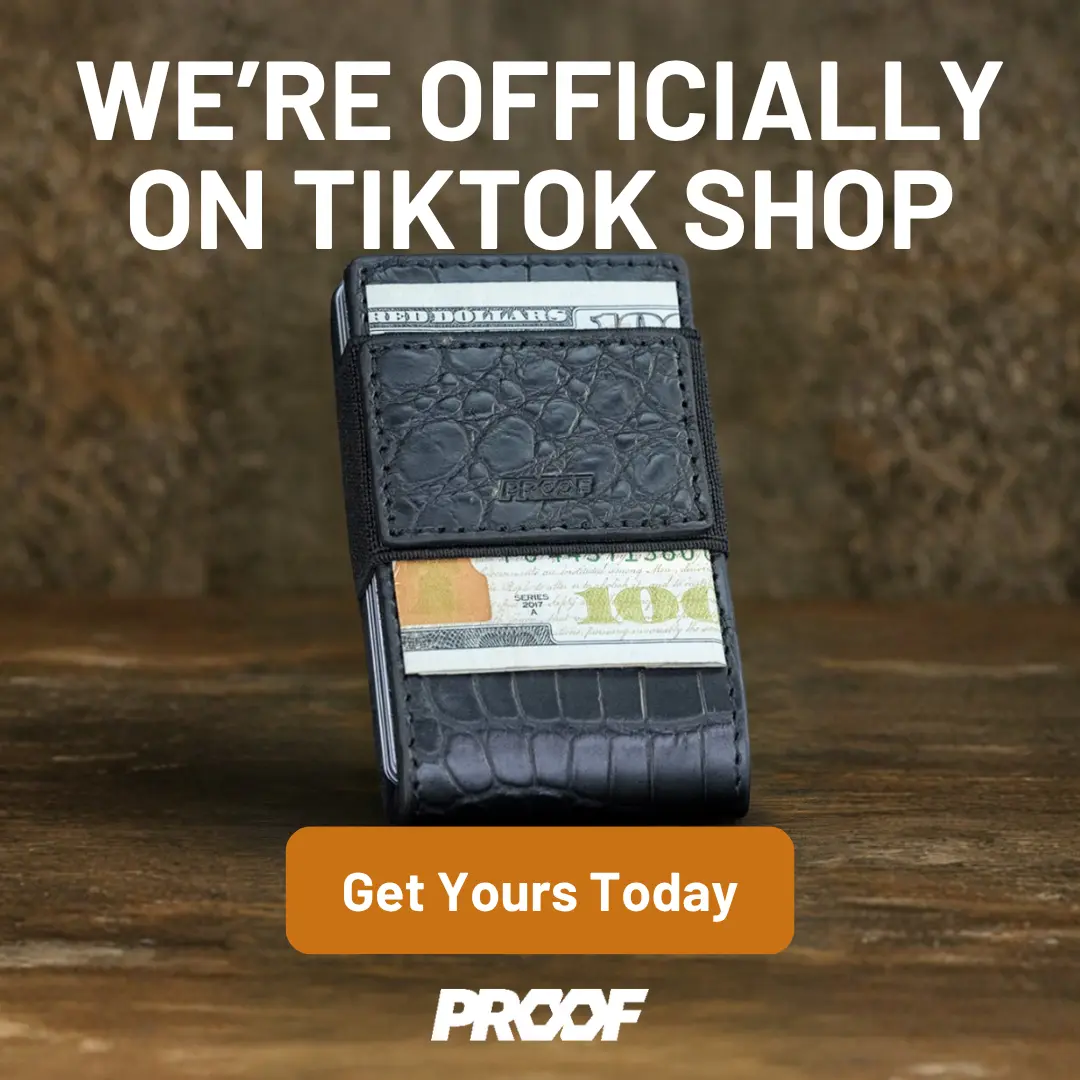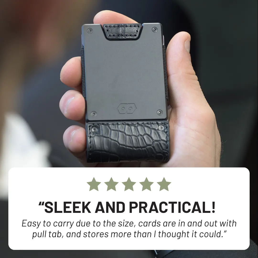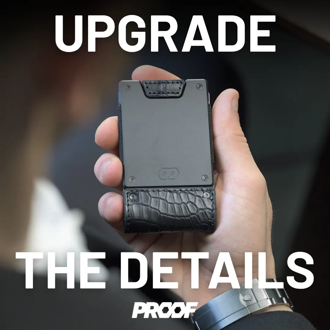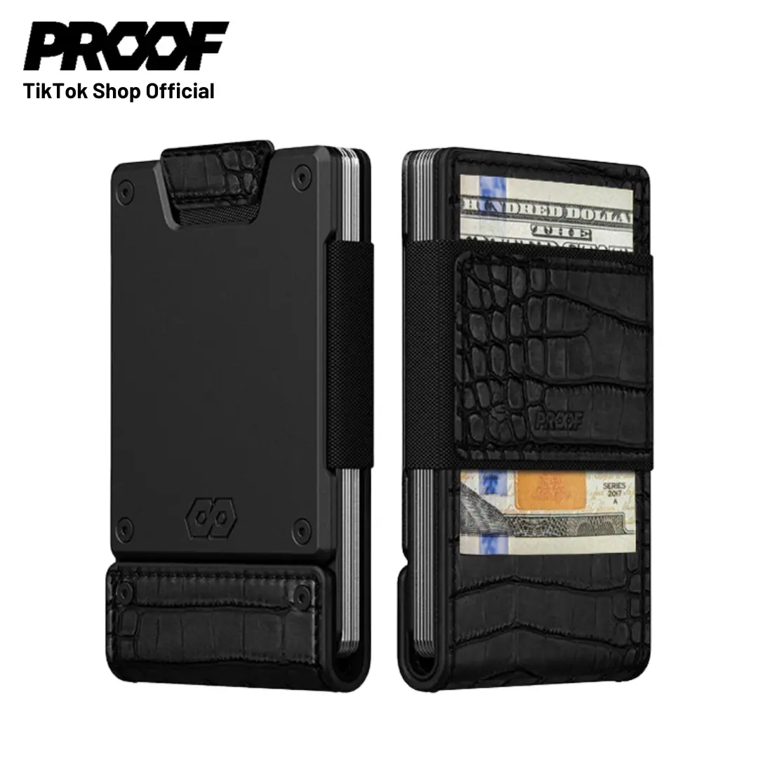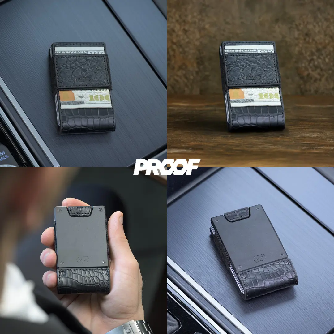 The PROOF Everglade minimalist wallet combines full grain crocodile leather and aerospace-grade aluminum to create a refined everyday carry wallet. Designed for durability while maintaining a slim profile, the wallet keeps cards and cash organized without the bulk of traditional wallets.
