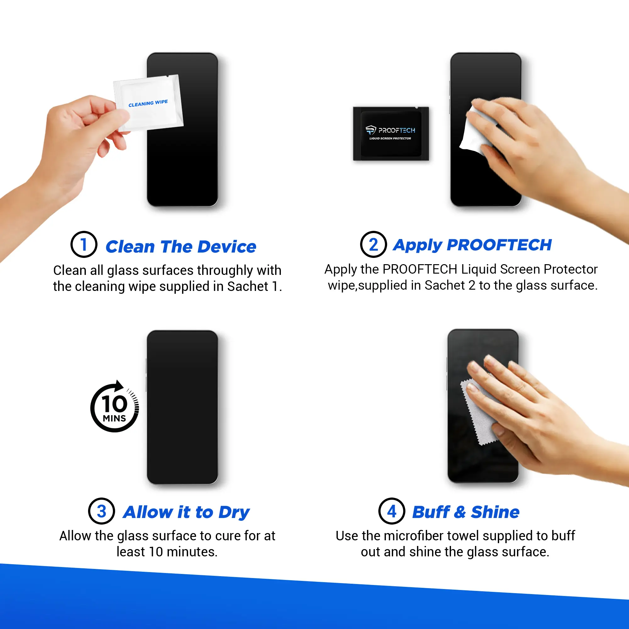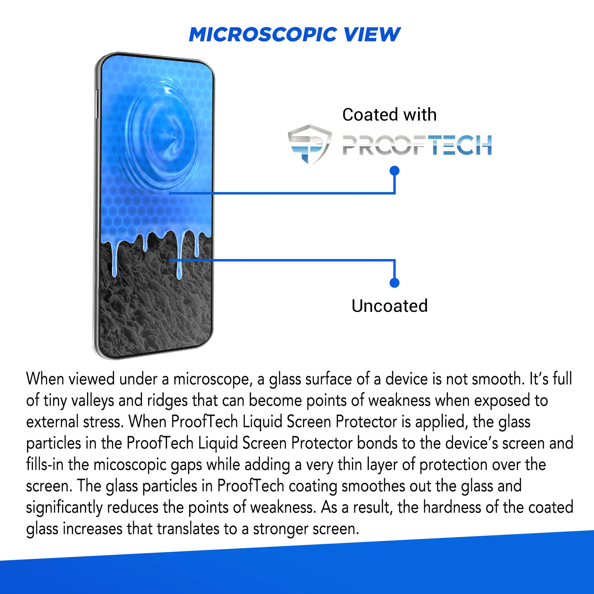 ProofTech Liquid Glass is a cutting-edge super durable, completely transparent liquid screen glass protector that bonds to the glass of your device offering greatly enhanced scratch, moisture, and impact resistance. It's made of silica dioxide (Si02) which is essentially microscopic particles of glass suspended in a liquid solution.Completely harmless and invisible once applied with easy wipe-on DIY application, Liquid Glass fills in the imperfections of the screen and adds an additional layer of glass (does Not fix or repair existing scratches or damages). It's extremely scratch & shatter resistant and it Increases the glass' strength to 9h hardness. Liquid glass screen protector is intended to protect your device's screen against regular scratches that may happen with regular use. It will NOT make your screen completely shatter-proof or scratch-proof. It will only improve your glass' strength and increase the scratch resistance. Your screen can still get scratched or broken with a liquid glass screen protector