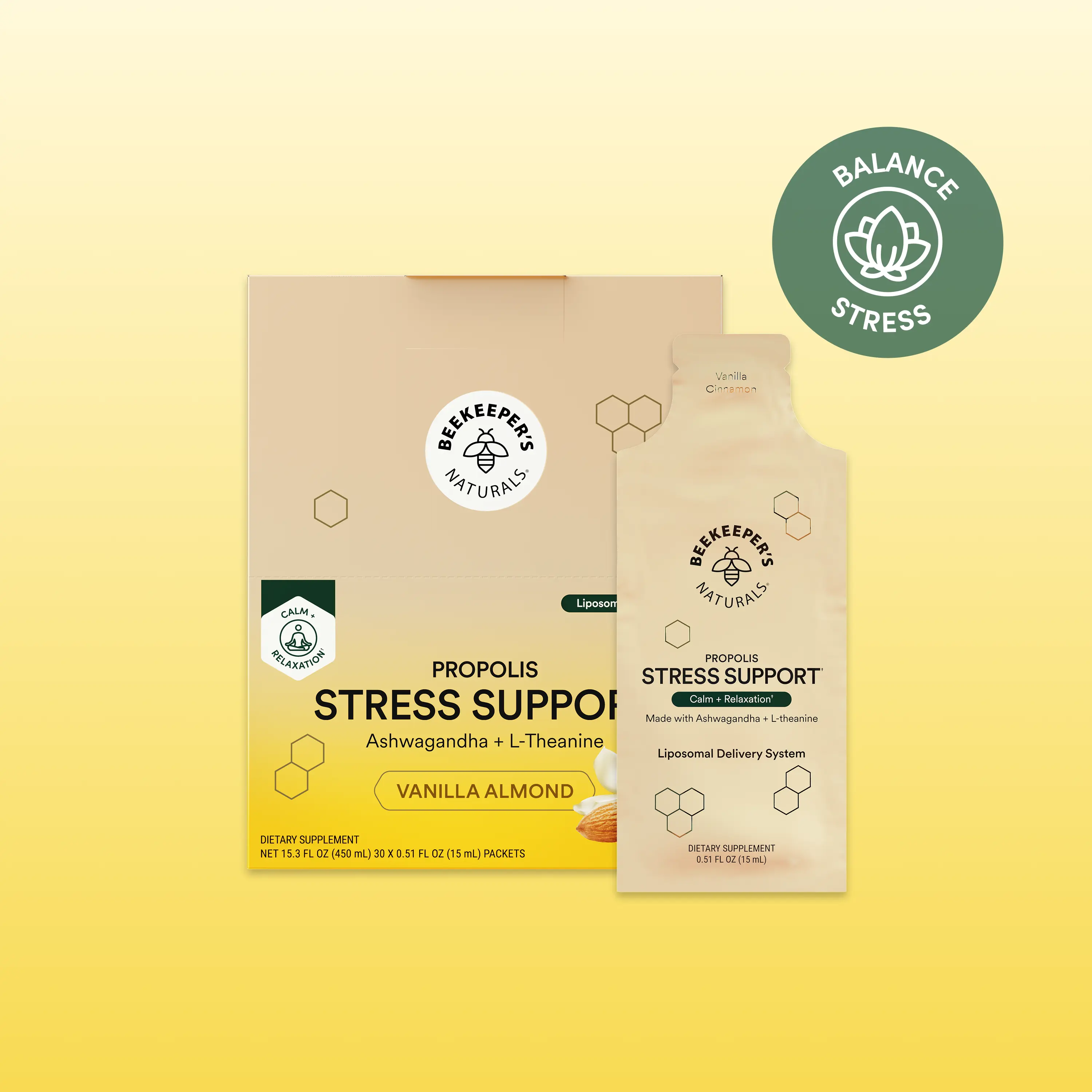 Elevate your mood while relaxing body and mind. Our new Stress Support Liposomal is formulated with powerful ingredients like Propolis, KSM-66 Ashwagandha, and L-theanine, for a synergistic combination that helps promote relaxation, manage cortisol levels, and reduce stress and anxiety.  Contains 30 sachets, 0.51 Fl Oz. (15mL) each.