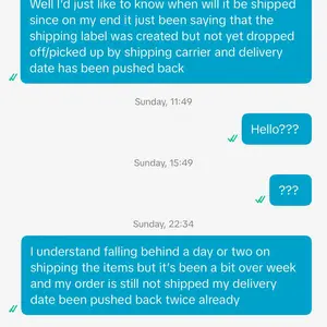 Did not receive… waited a week and requested an update on my order since it was still not shipped & nothing that same Friday I got a reply but no actual update I was just told they had high demand & were falling behind… Saturday no reply & delivery date was pushed back once again… Sunday I messaged again I just wanted an update with a delivery date since “label was created” was still the only thing on my end and “seller has exceeded the shipping window”… Monday morning still no update or tracking information by 7pm they reply saying my order was delivered?? 🥴