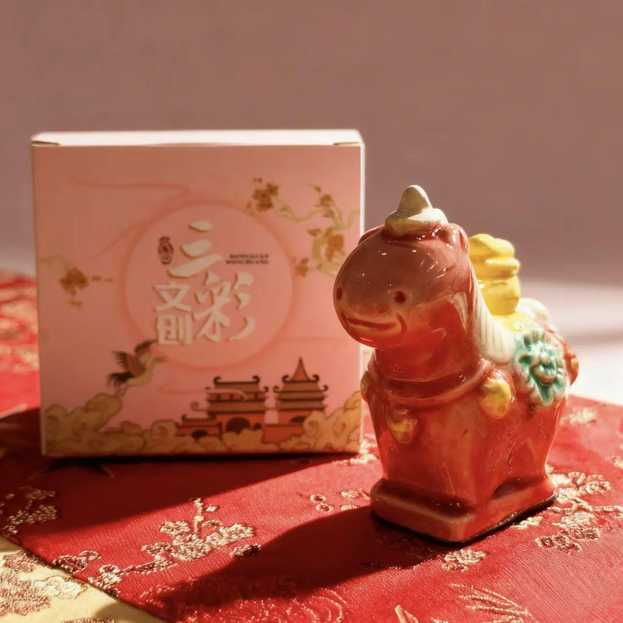 Features: The brown-glazed body (fired in a wood kiln) has a rustic aged-tree-bark texture; hand-splashed rust-red glaze flows into abstract florals, with hidden “fortune-attracting” coin patterns on the saddle—blending Eastern aesthetics & blessings.