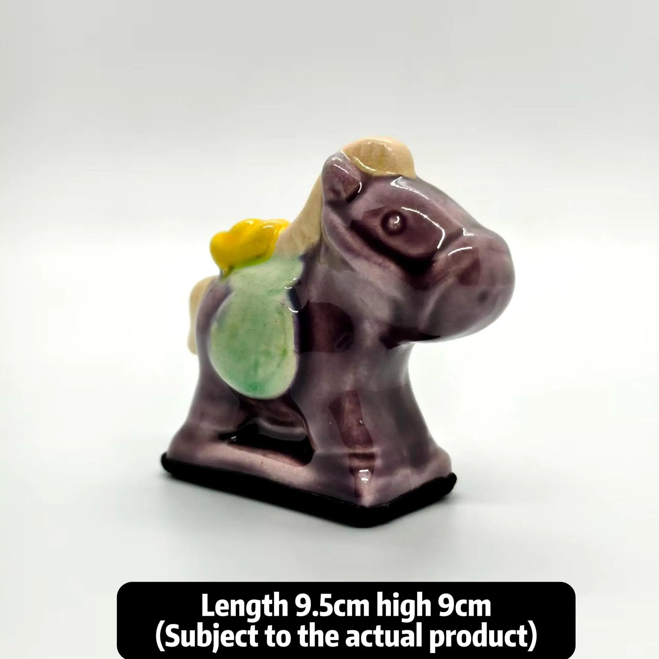 Features: Hand-colored with traditional Sancai craft— the main purple glaze is warm & glossy, with light white glaze on the mane, and yellow ingot + green coin-bag decorations on the saddle (representing the Eastern blessing “fortune on the horse”). Fired in a 1250℃ wood kiln, it has a smooth glaze and a compact shape perfect for tabletop display.