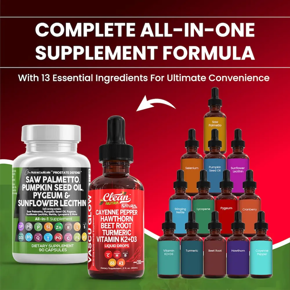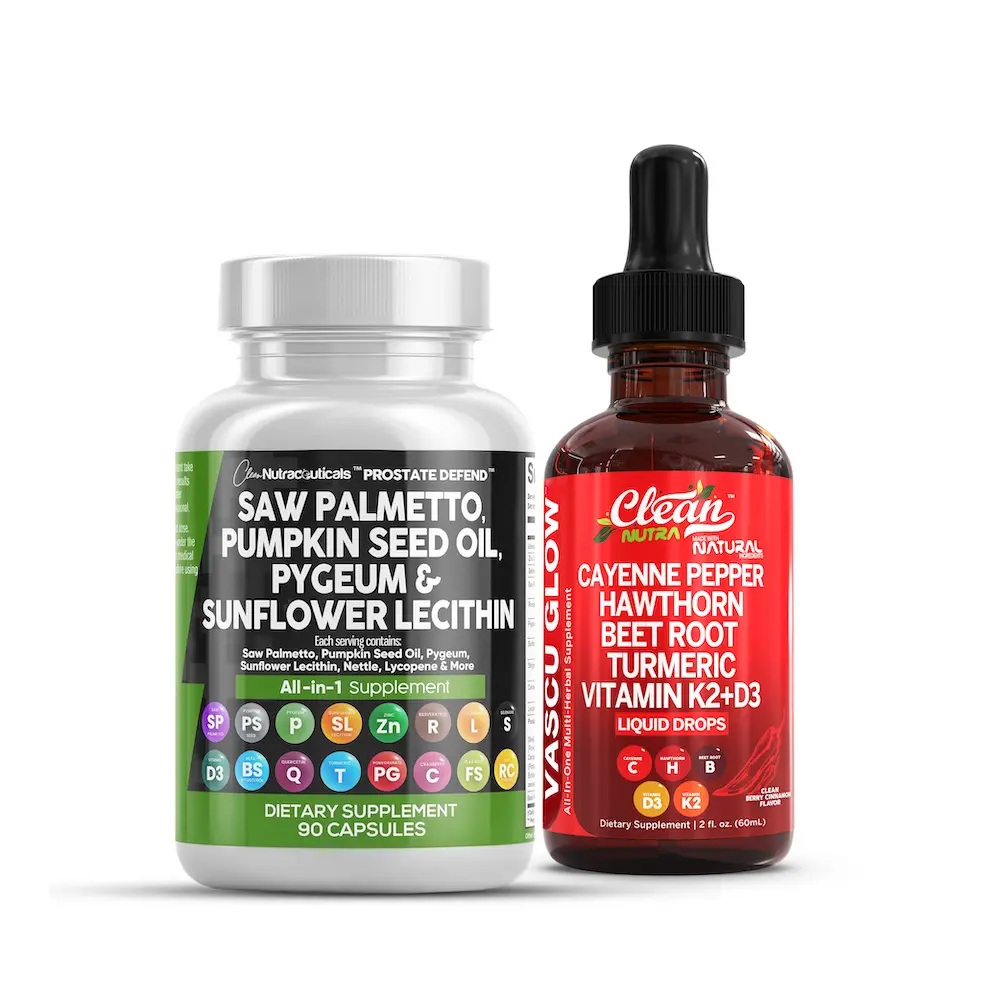 Prioritize your wellness with the Prostate & Heart Support Duo from Clean Nutra — a powerful 2-product stack designed to help men support optimal prostate function and cardiovascular health. Featuring Prostate Defend capsules and Vascu Flow liquid drops, this targeted combo promotes hormonal balance, circulation, and immune support from the inside out.