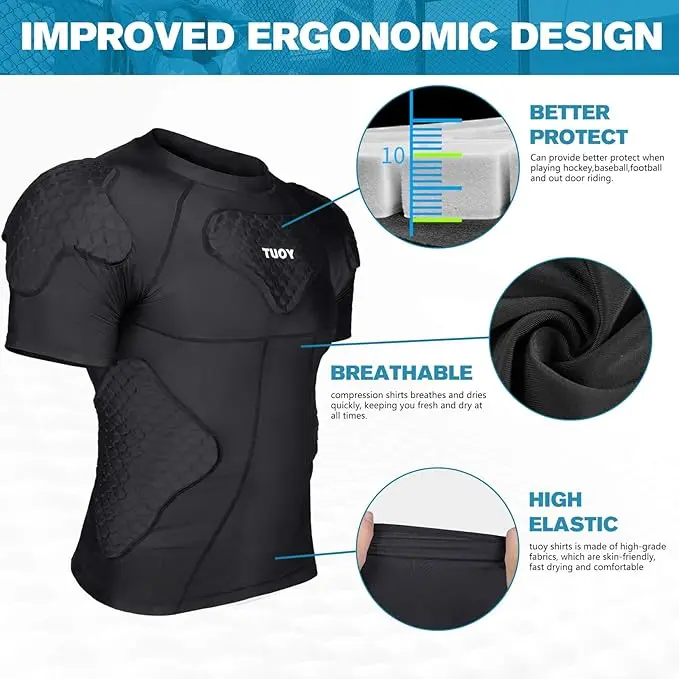 ·This new padded shirt is perfect for football, baseball, basketball, rugby, soccer, paintball, snowboarding, skiing, cycling, hockey and all other contact sports than needs padding support and protection.
