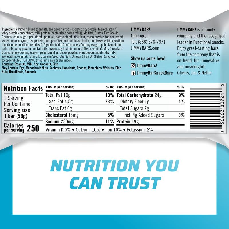 JiMMYBAR! is proud to be the only high-protein bar whose first ingredient is REAL FOOD. Our homemade, small-batch peanut butter base gives you the perfect kick to power through the day. None of that artificially processed crap — just functional ingredients packed with amazing taste. . Infused with key ingredients like Guarana caffeine, MCT oil, and Omega-3s, JiMMYBAR! feeds your brain while delivering 19g of protein and only 6g of sugar to keep you sharp, strong, and dialed in all day.