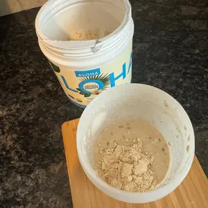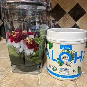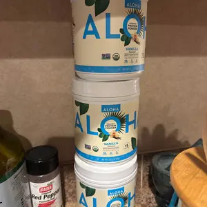 Love this protein powder mainly because it's the only or one of the few which uses coconut sugar and a little monk fruit extract to sweeten. No stevia! No sugar alcohol sweeteners. I find the taste very pleasing. My favorite smoothie is one heaping scoop each of vanilla and chocolate protein powders, 4 dates, tablespoon of flax seeds, ice, and vanilla extract. Using my Vitamix, the powder dissolves well. Flavors are excellent. Aloha protein powder drinks are versatile, delicious, and light yet filling, especially if I add fruit, seeds, and/or nuts. (BTW, in case the text in the photo is too small, that whipped topping is Whipped Yogurt.)