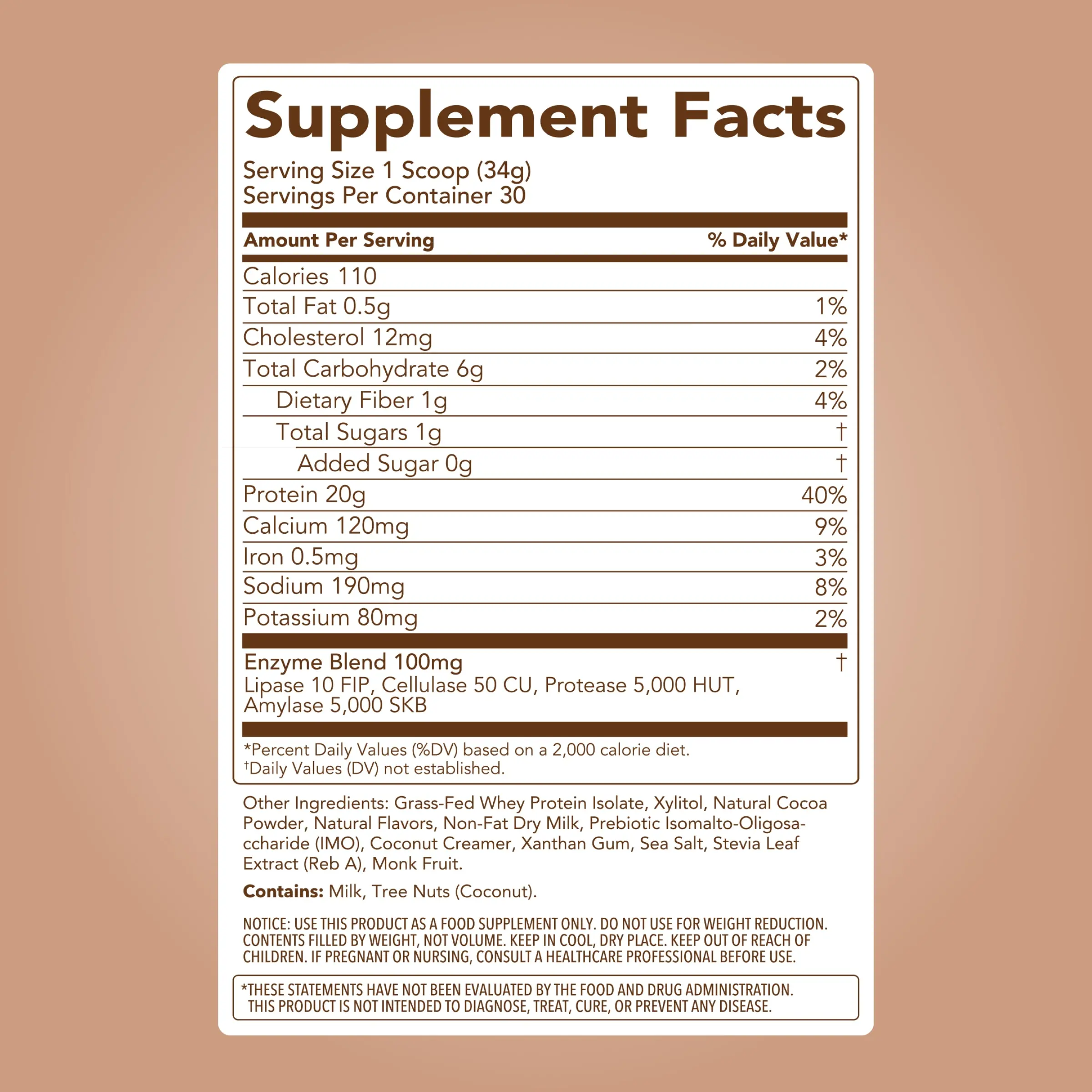 IngredientsEnzyme Blend 100mg,Grass-Fed Whey Protein Isolate,Xylitol,Natural Cocoa Powder,Natural Chocolate Flavor,Non-Fat Dry Milk,Prebiotic Isomalto-Oligosaccharide (IMO),Coconut MCT Oil Powder,Xanthan Gum,Sea Salt,Sunflower Lecithin,Natural Vanilla Flavor,Organic Stevia Leaf Extract (Reb A),Natural Peanut Butter Flavor,Organic Monk Fruit