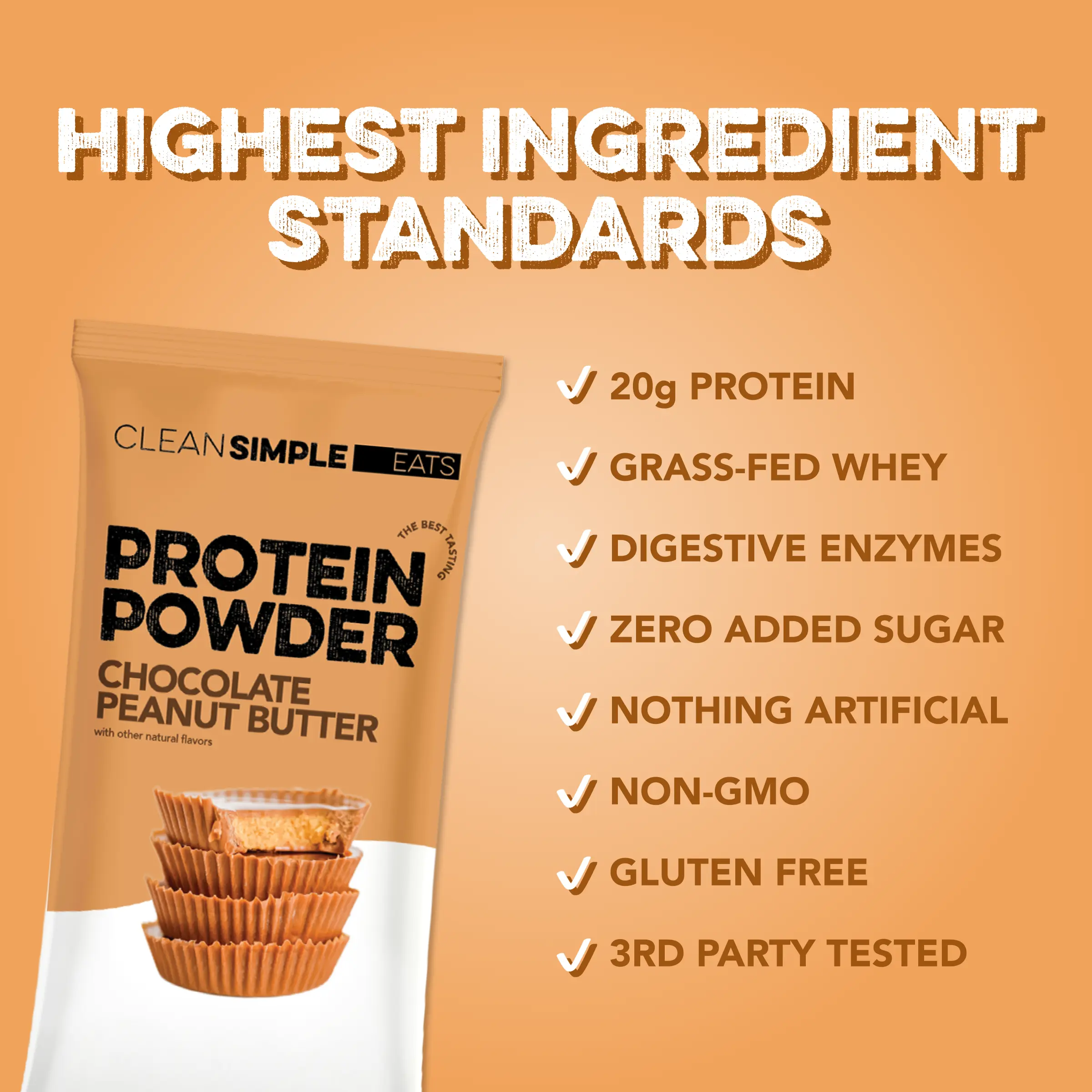 Just like a PB cup, Chocolate Peanut Butter Protein Powder is packed with 20g of grass-fed whey protein isolate in every serving. Undeniably clean, 100% delicious, and made to enjoy every day. Increase your protein intake, fuel your day, and feel your best.