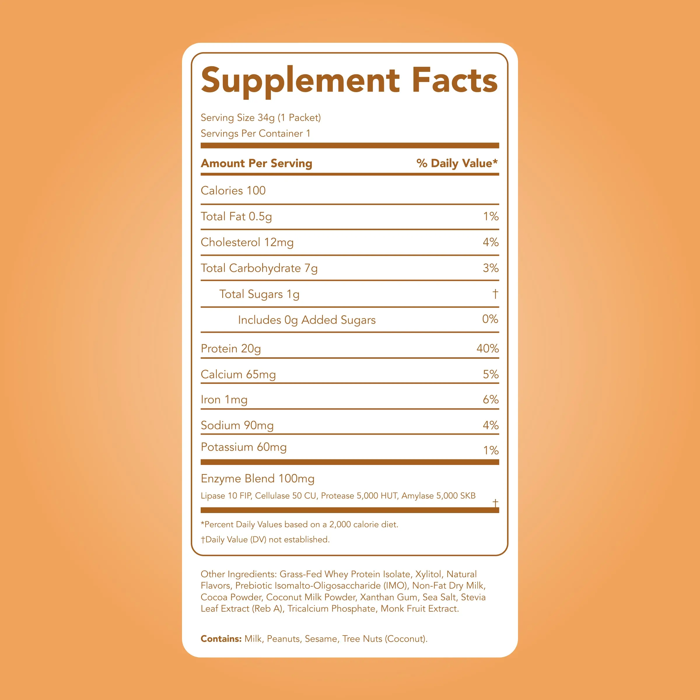 IngredientsGrass-Fed Whey Protein Isolate,Xylitol,Natural Flavors,Prebiotic Isomalto-Oligosaccharide (IMO),Non-Fat Dry Milk,Cocoa Powder,Coconut Milk Powder,Xanthan Gum,Sea Salt,Stevia Leaf Extract (Reb A),Tricalcium Phosphate,Monk Fruit Extract.