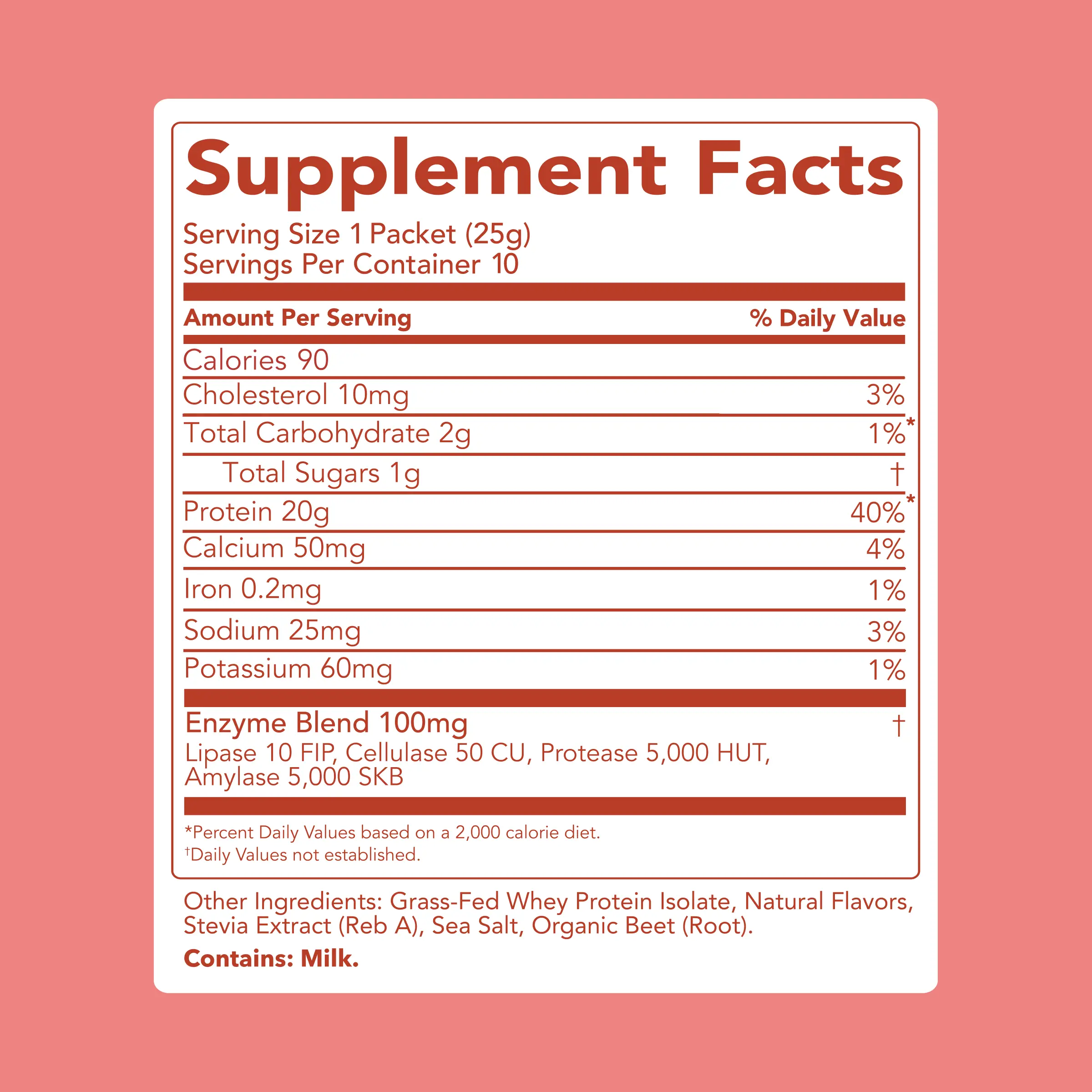 IngredientsDigestive Enzyme Blend 100mg,Grass-Fed Whey Protein Isolate,Xylitol,Prebiotic Isomalto-Oligosaccharide (IMO),Natural Flavors,Non-Fat Dry Milk,Coconut Creamer,Xanthan Gum,Sunflower Lecithin,Stevia Leaf Extract (Reb A),Sea Salt,Beet Root (for Color),Monk Fruit