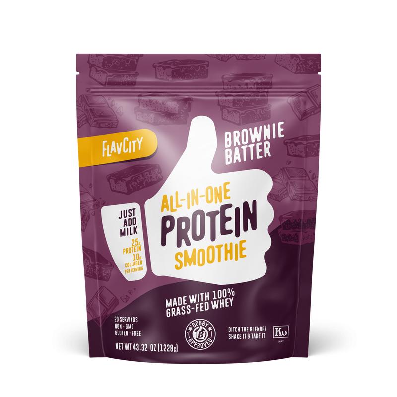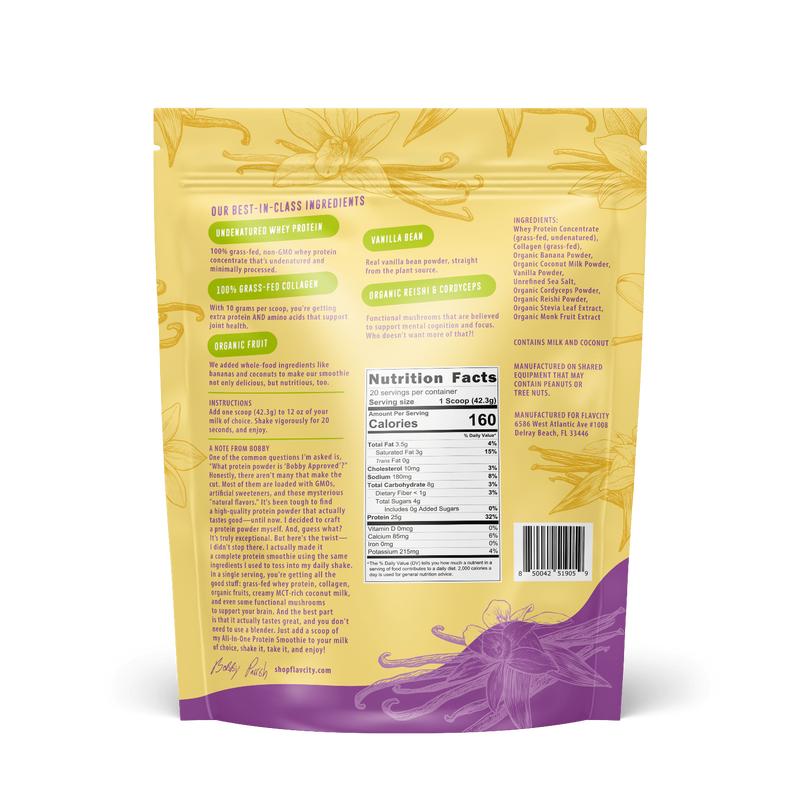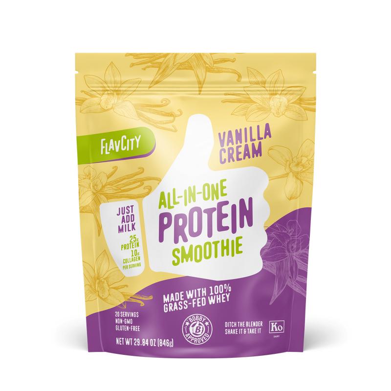 ·Two 20-serving bags of FlavCity’s most popular All-in-One Protein Smoothie flavors; Vanilla Cream and Brownie Batter.
