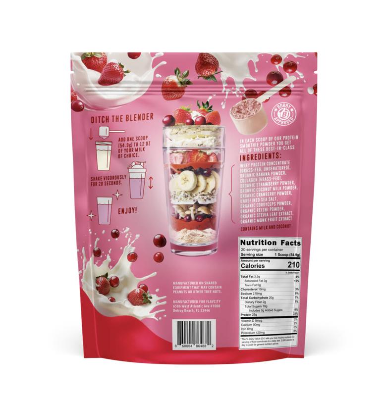 Our Berries & Cream Protein Smoothie blends sweet, juicy strawberries and cranberries with a smooth, creamy finish—made with 100% grass-fed whey. We keep it simple with real ingredients like strawberries, cranberries and coconut milk powder to round out that classic berries-and-cream flavor. Each serving packs: 25g of protein, 10g of collagen, fruits, and functional mushrooms (cordyceps & reishi). Rather than buying all the ingredients separately, everything you need is now packed into one scoop for only $2.99 per serving. And the best part? No blender needed—just add milk or water, shake, and enjoy.