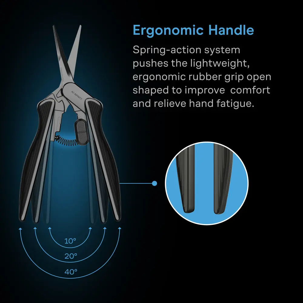 The pruning shear is crafted for use with small plants and flowers to improve their growth process. Best used for trimming flowers, herbs, bonsai trees, vegetables, or other plants. Its micro-tip blades allow you to make precision cuts in even the smallest of spaces and will stay sharp. Use it in any grow setting like outdoor gardens, hydroponics builds, grow tents, and greenhouses.