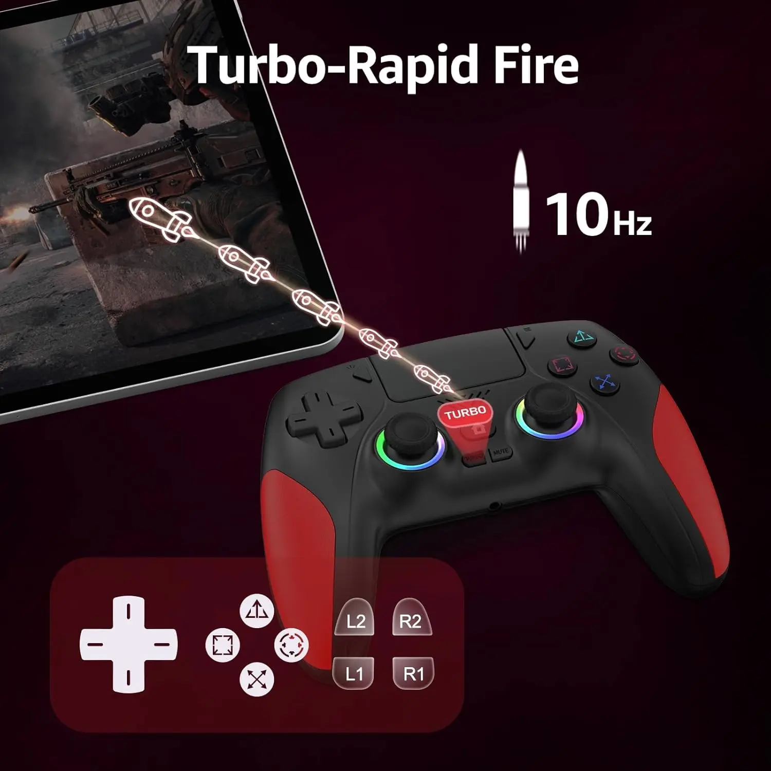 【Turbo Function】Press the Turbo button + any target button of the controller to activate rapid auto-pressing (10Hz), creating a seamless rapid-fire effect