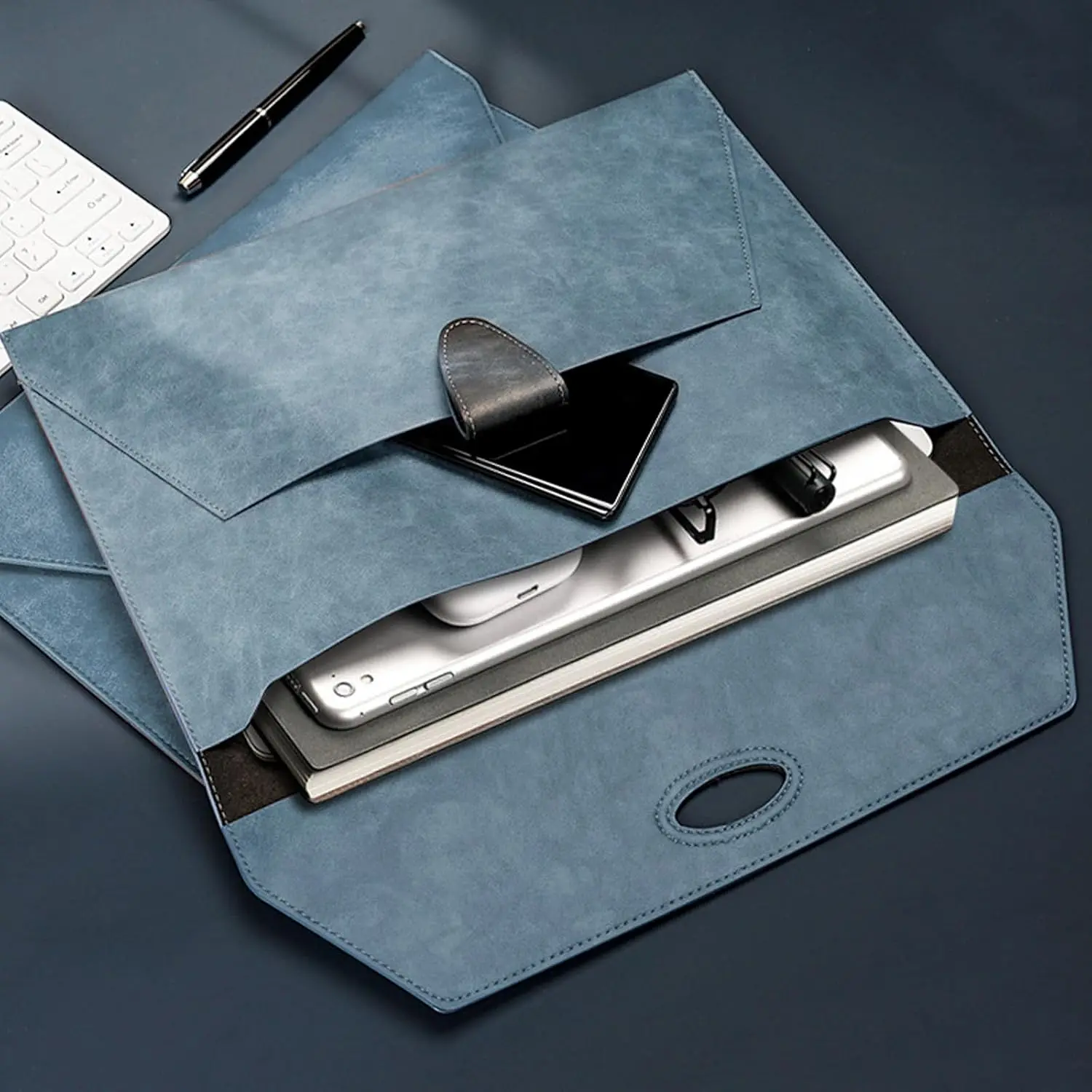 [Design] The beautiful dark blue of document folders helps business people show professional attitude and steady personality. The design of strap and button snap closure can fulfill your need for expressing personalization. It's also suitable for students to take it with them to attend class.