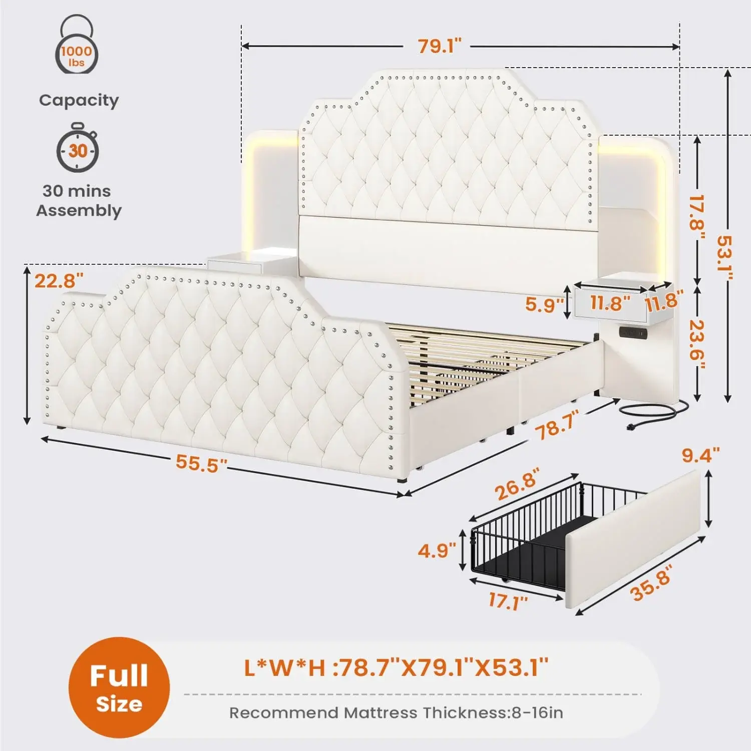 The bed frame with Charging Station, which is very convenitnt for you to charge your phones and electronic devices. This feature ensures that devices are always within easy reach, making it an ideal addition to any bedroom.