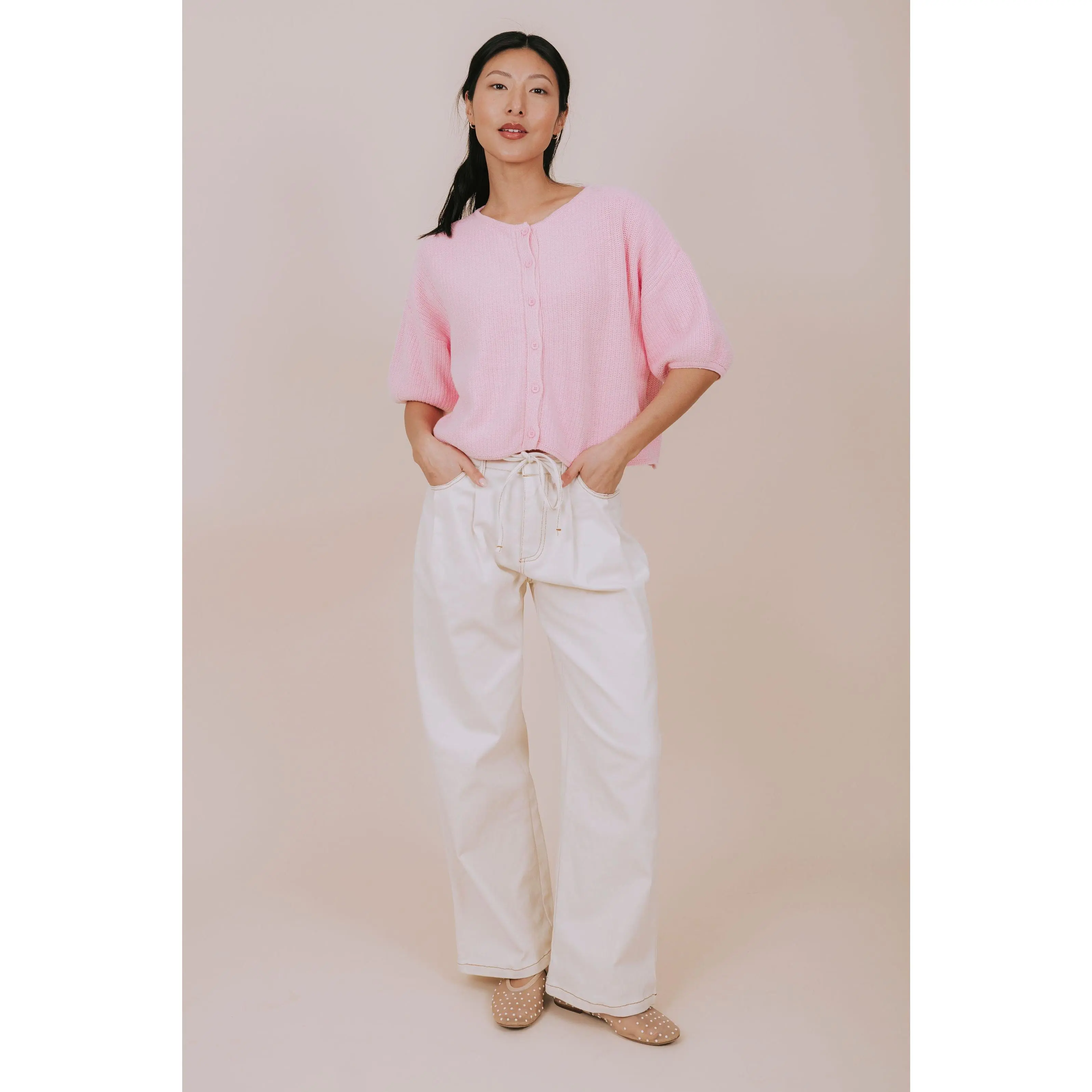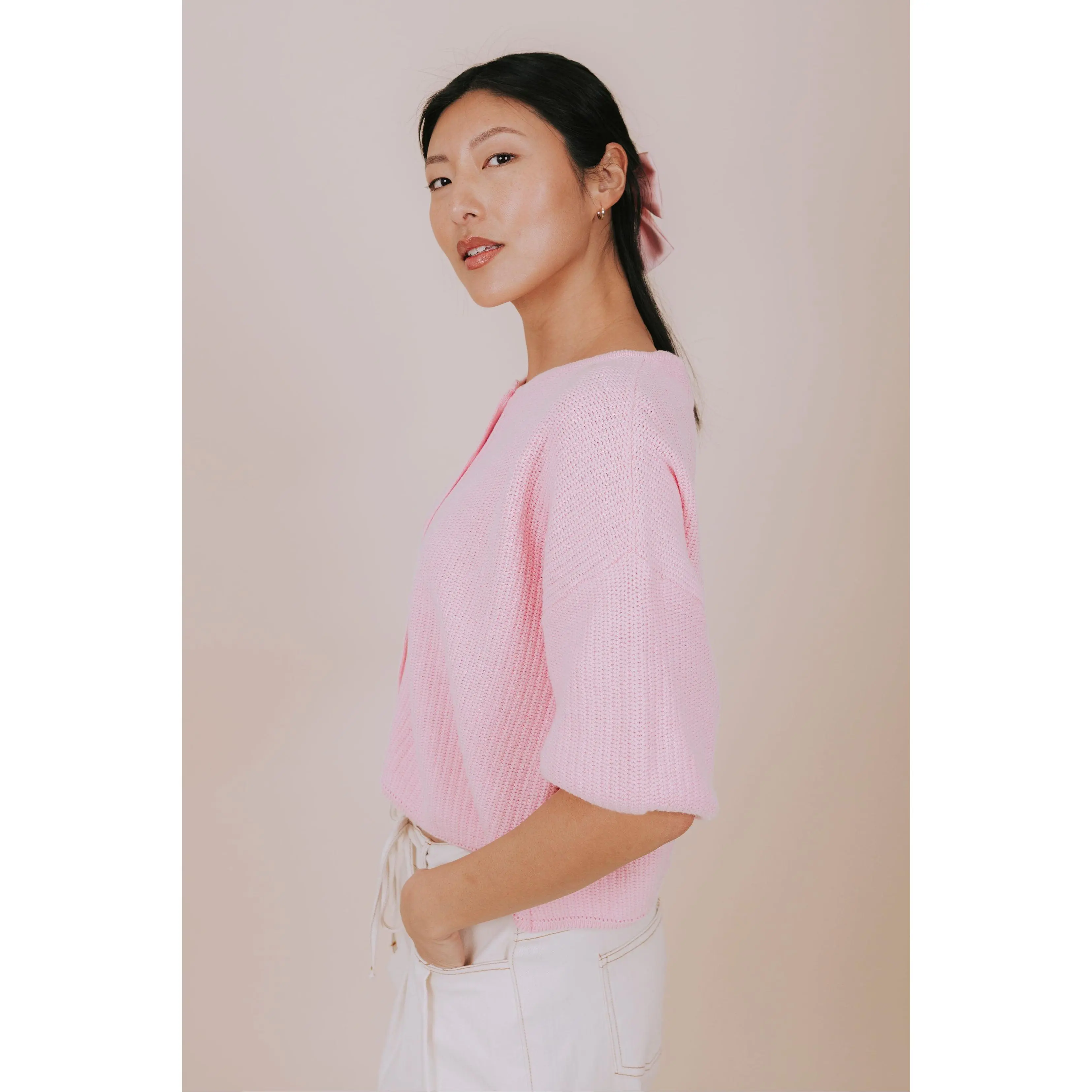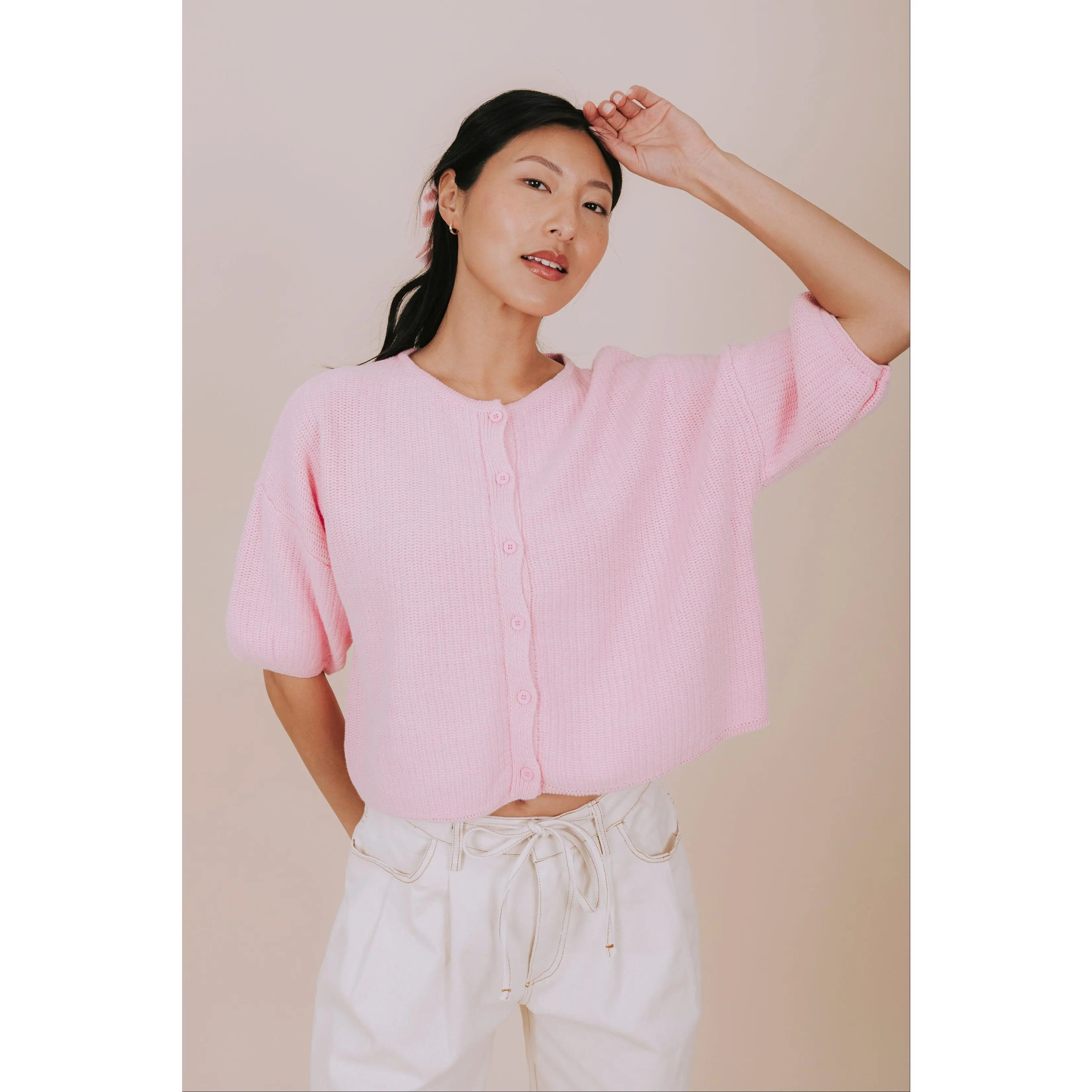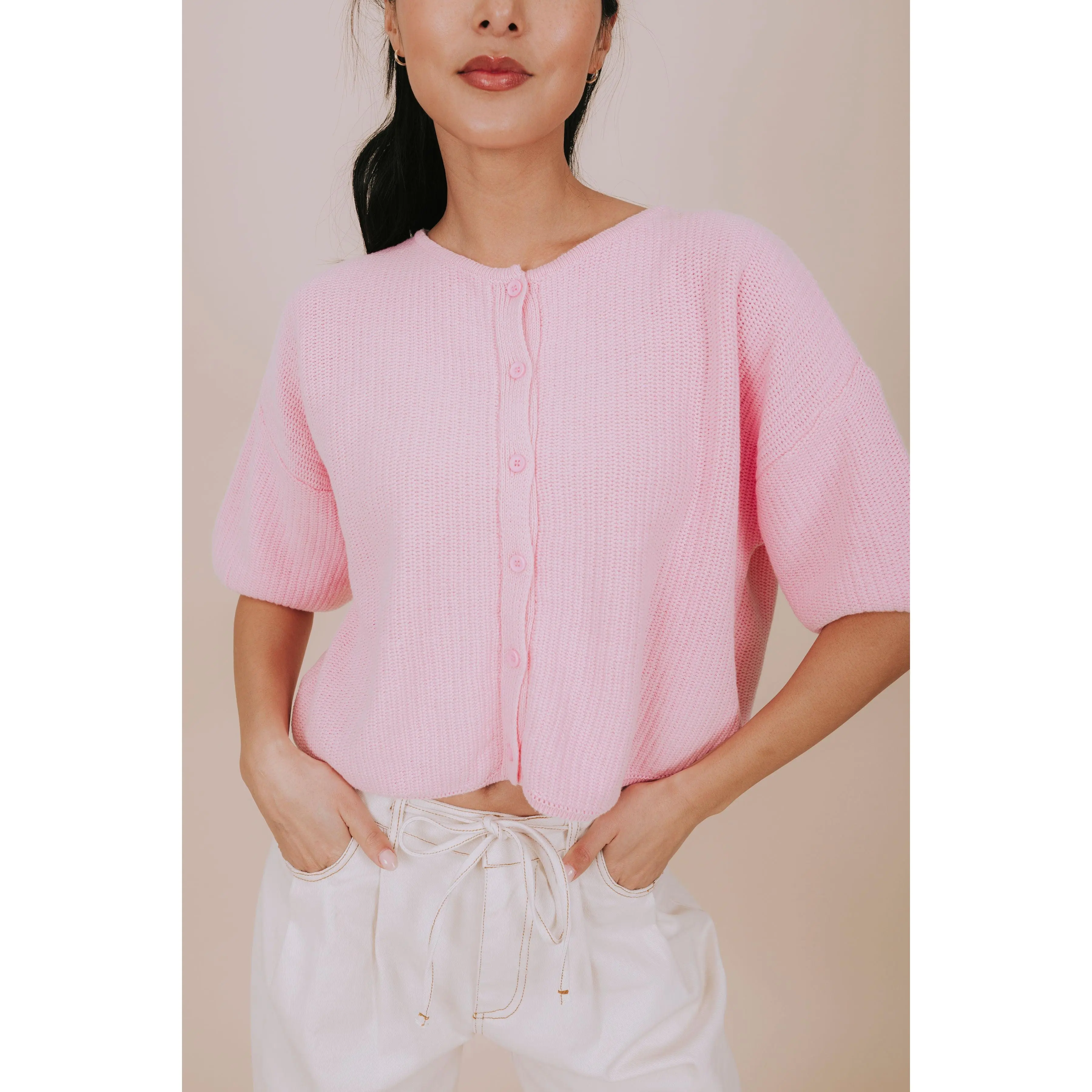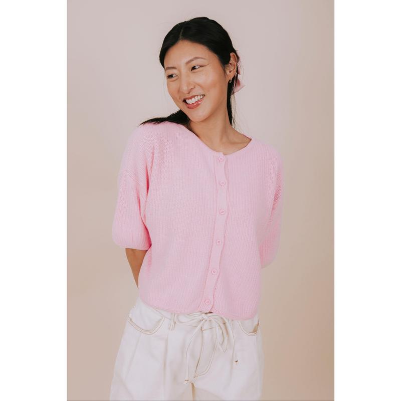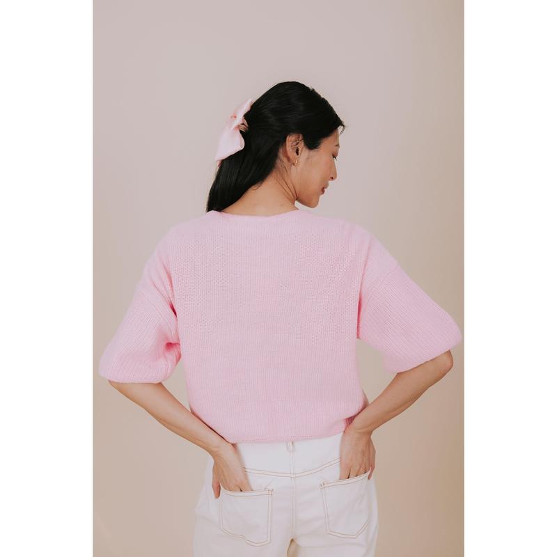 Pucker Up in this adorable pink knit top that's ready to steal the show! Featuring a cropped silhouette with short sleeves and a charming round neckline, this piece brings effortless charm to any outfit. The button-down front adds a flirty touch while keeping things casual and cool. Perfect for layering or wearing solo, this knit essential is your new go-to for laid-back style with personality.