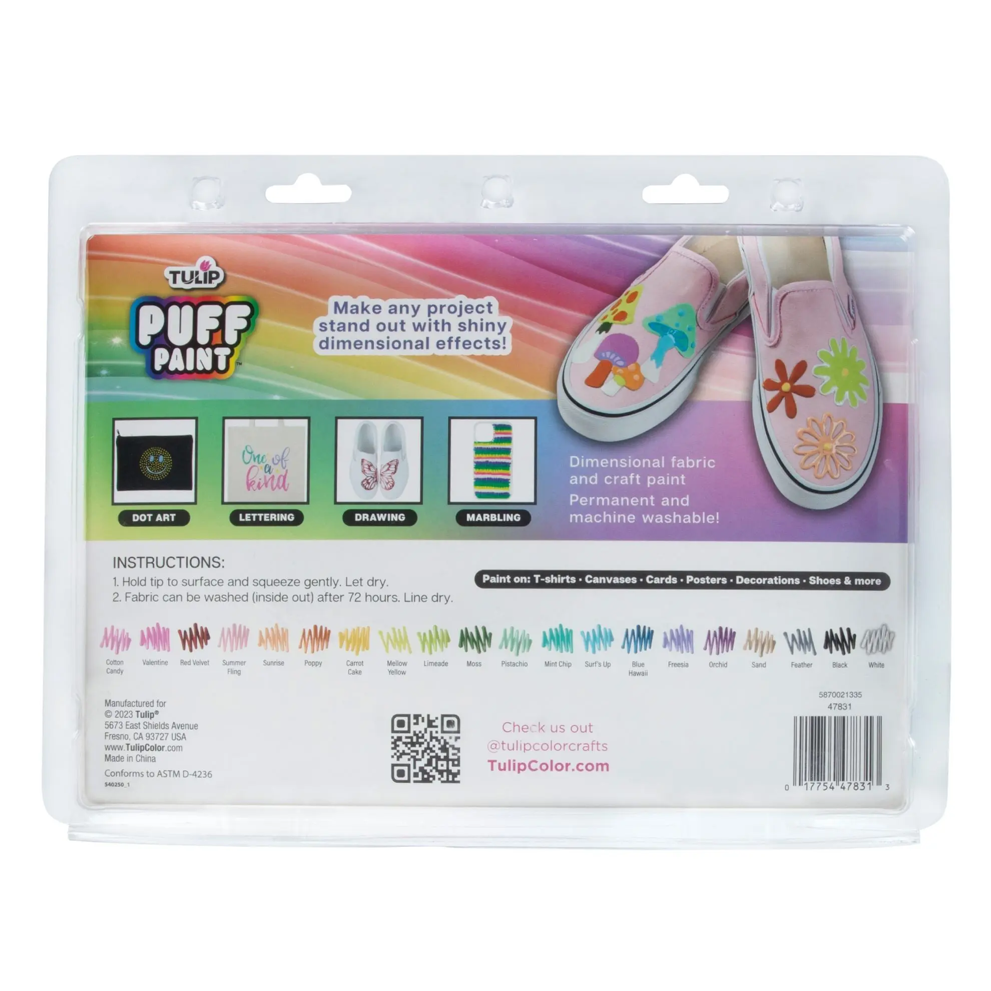 Make your craft and fashion projects stand out with Puff Paint! Tulip Puff Paints dry permanent, flexible and machine washable with fun dimensional texture that stands out on every project. These nontoxic paints are used by crafters of all ages and skill levels on everything from educational crafts to statement T-shirts, canvas art, accessories, gift giving, seasonal décor and so much more! The Mellow Rainbow Pack includes 20 (.75 fl. oz) shiny Puff Paints in a pretty pastel palette: Cotton Candy, Valentine, Red Velvet, Summer Fling, Sunrise, Poppy, Carrot Cake, Mellow Yellow, Limeade, Moss, Pistachio, Mint Chip, Surf’s Up, Blue Hawaii, Freesia, Orchid, Sand, Feather, Black, and White.