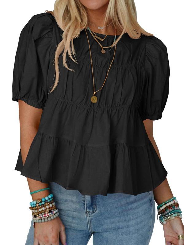 Imily Bela Womens Puff Sleeve Peplum Babydoll Tops Summer Smoked Pleated Cotton T-Shirts Casual Loose Fit Flowy Blouse