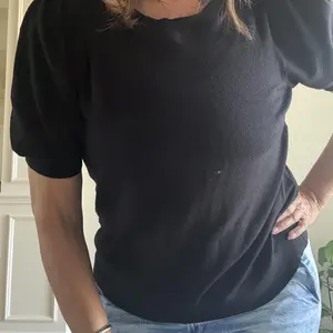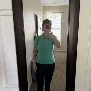 ·The image shows a model wearing the green puff short sleeve sweater, paired with jeans.