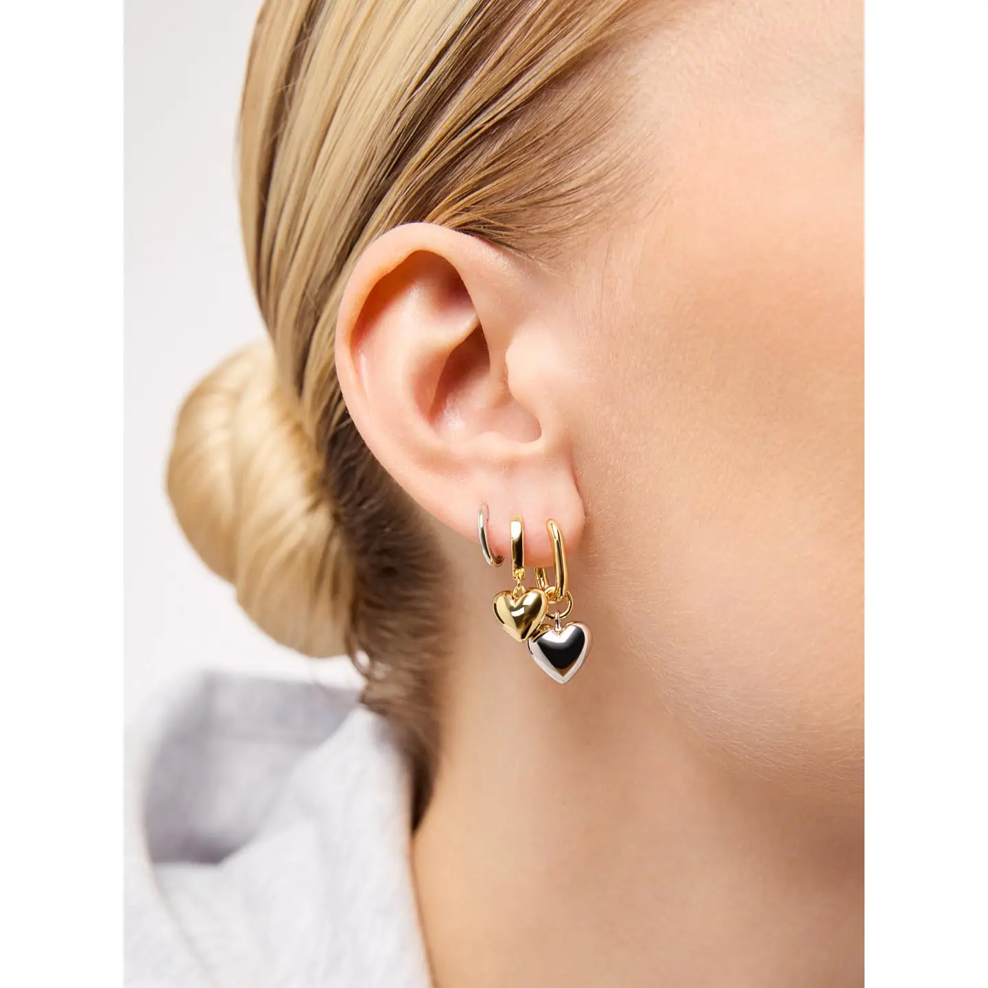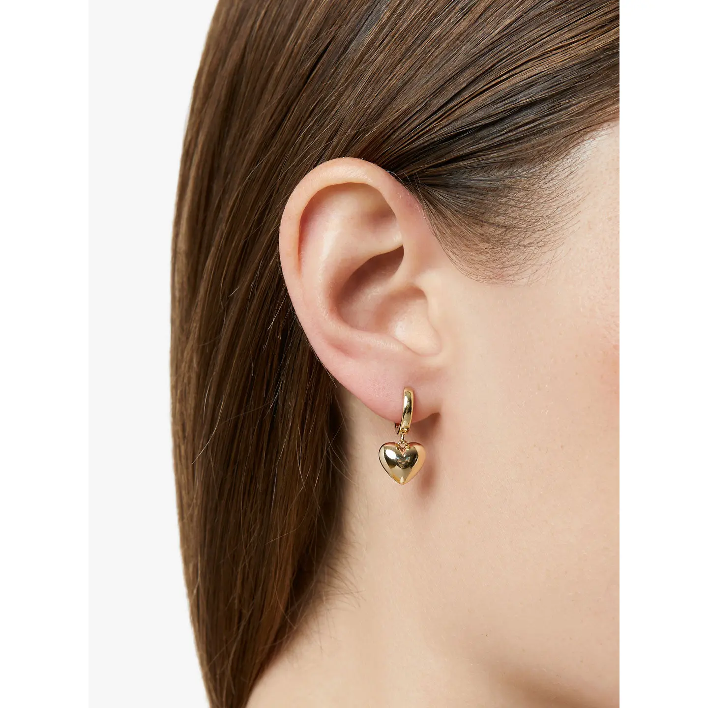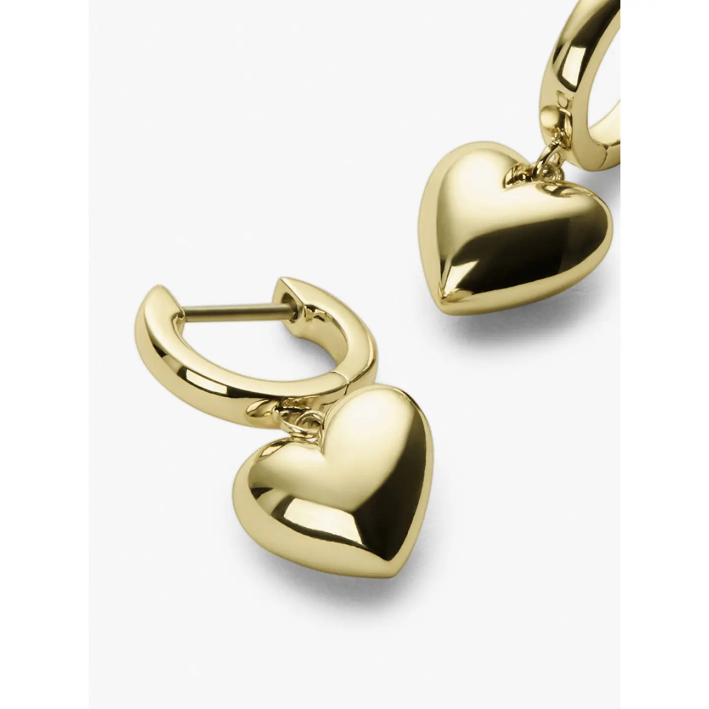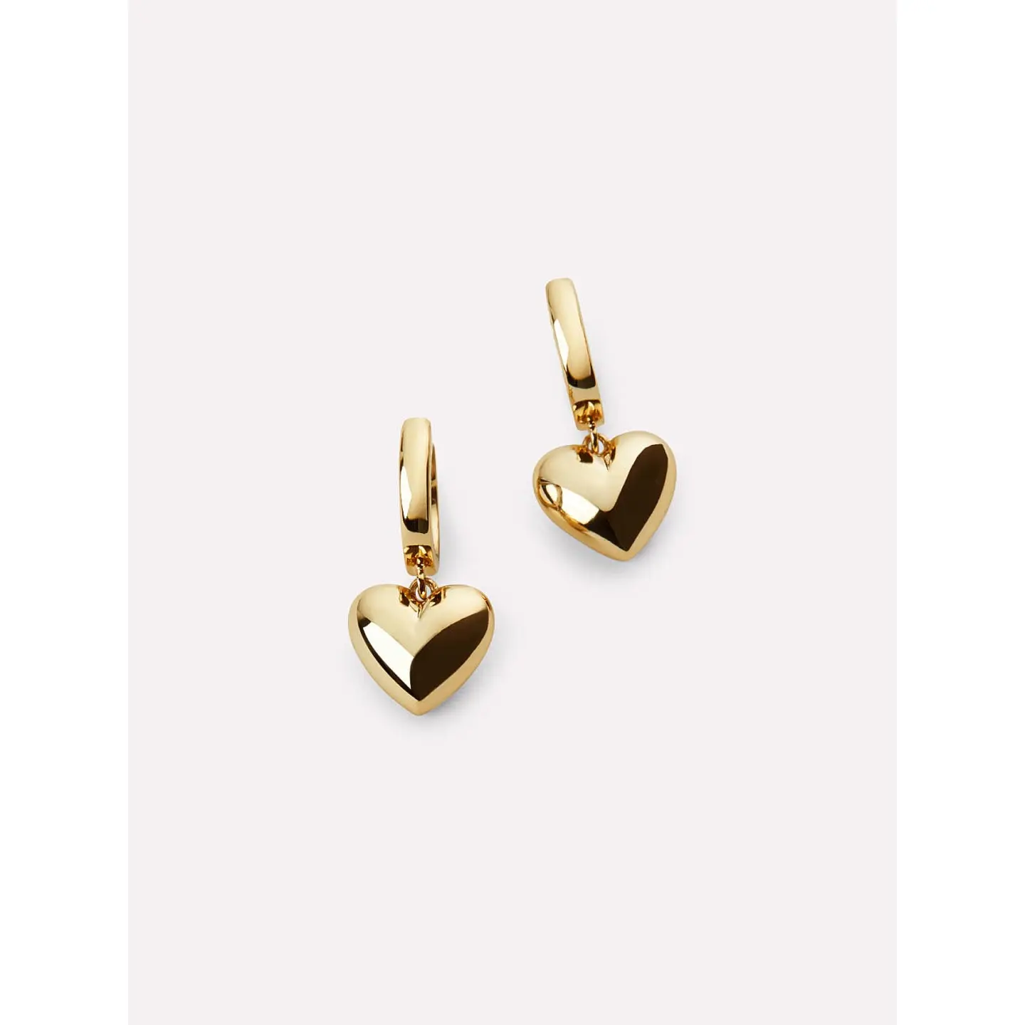 • Sleek gold hoops with puffed heart charms • Coated with a thick 14K gold layer