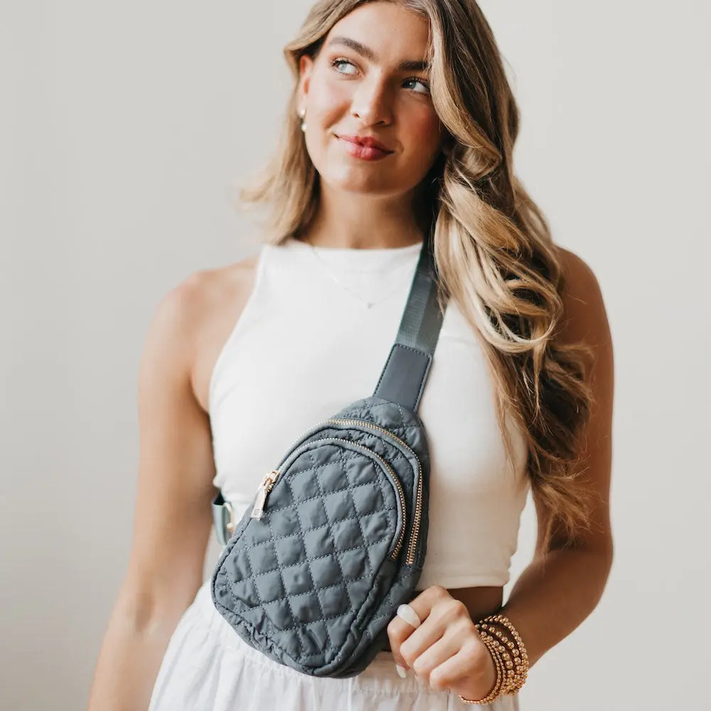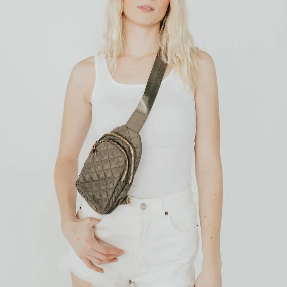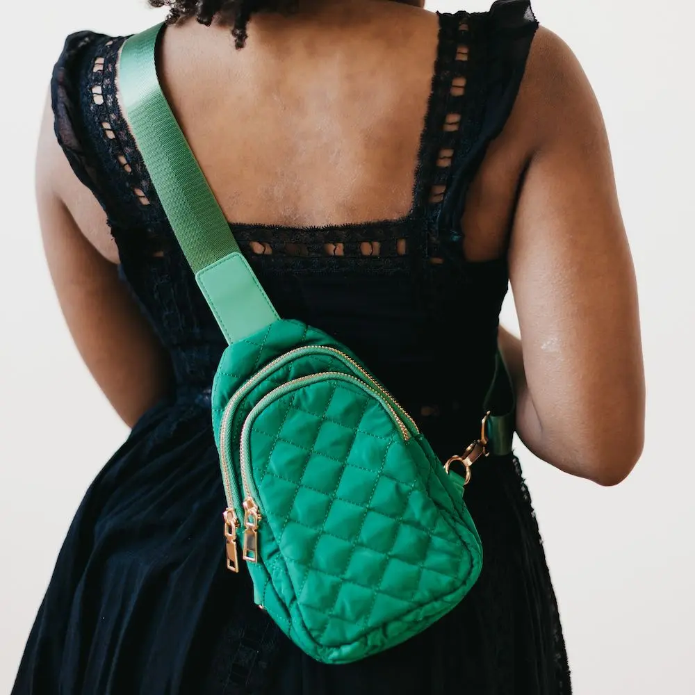 Meet the Pinelope Puffer Bum Bag, the perfect all year round quilted crossbody bag. It has an adjustable strap, gold detailing, a chevron interior, and two pockets. Both pockets are large enough to hold all your necessities, and the front pocket also has a built in card/cash holder. The bag is designed so you can wear the crossbody on either your right or left shoulder, as there are rings on both sides of the bag. Available in black, cream, olive, gray, navy, fuchsia, and emerald, this bag is guaranteed to complete any of your outfits!