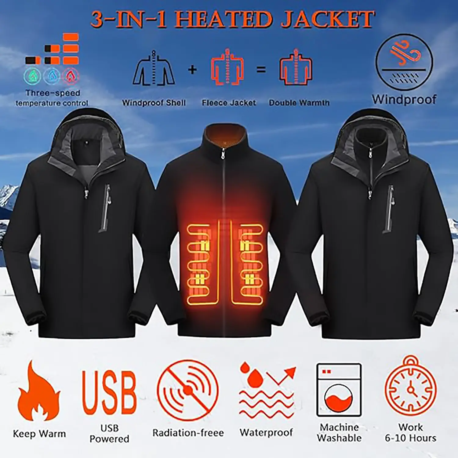 [Power Bank or Battery Pack Not included] Unisex 3-in-1 Puffer Coat Waterproof Heated Jacket with Massage Removable Warm Iiner Fleece Jackets