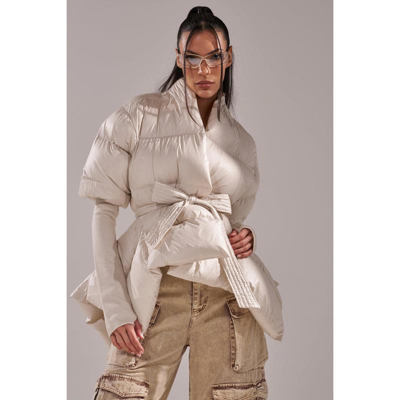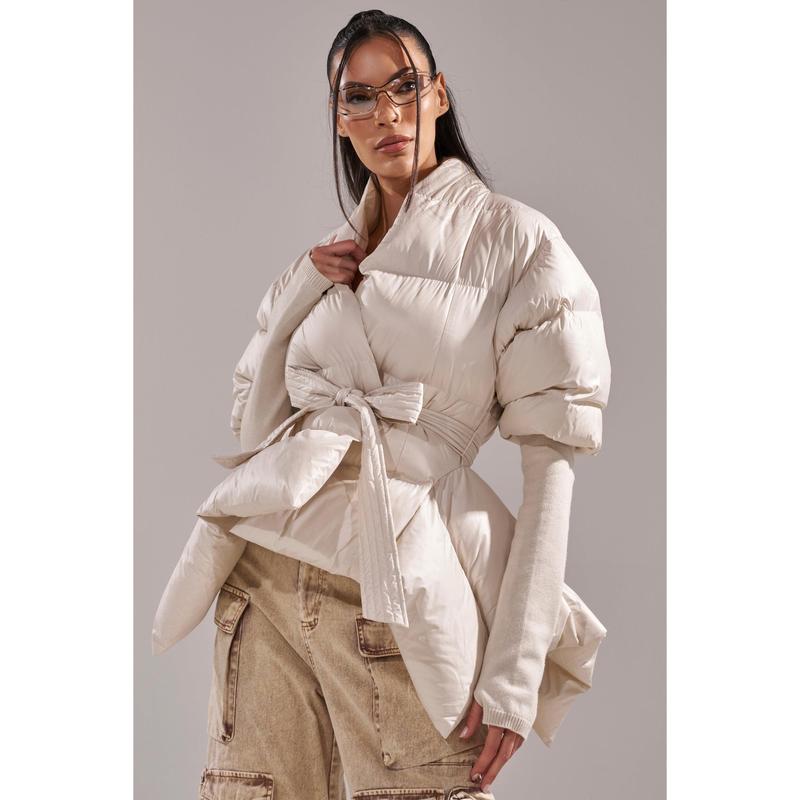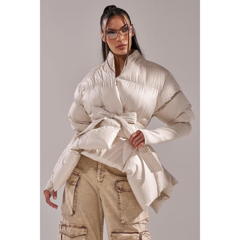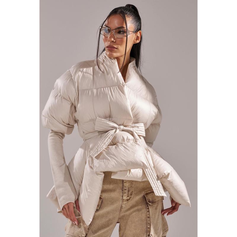 Wrap yourself in luxury with The AKIRA Label Rib Sleeve Peplum Puffer In Ivory. This chic outerwear piece features an ultra cozy puffer base, a paneled construction, a cocoon collar, long ribbed knit sleeves with thumbholes for added warmth, a self-tie coordinating waist belt, and a voluminous peplum silhouette with a subtle high-low cut and pointed hemlines. Pair with straight leg jeans, a knit scarf, and fur boots for a finished look.- Shell: 100% Polyester, Sleeve: 45% Viscose 28% Polyamide 27% Polyester, Lining: 100% Polyester- No Wash- Imported(all measurements approximate from size small)- 24” Shoulder to Cropped Hem, 30” Shoulder to Extended Hem- 32” Sleeves- 18” Shoulder to Shoulder- Model is 5’8” and is wearing size smallProduct ID: 469316(all measurements approximate from size 1X)- 26” Shoulder to Cropped Hem, 32” Shoulder to Extended Hem- 33” Sleeves- 20” Shoulder to ShoulderProduct ID: 469320