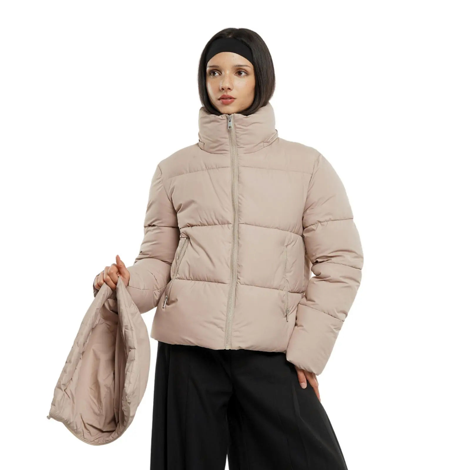 - Stand-up collar for neck insulation.