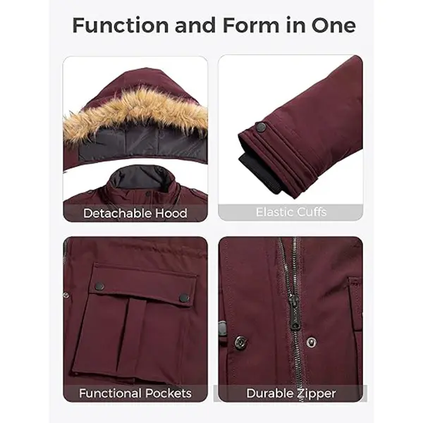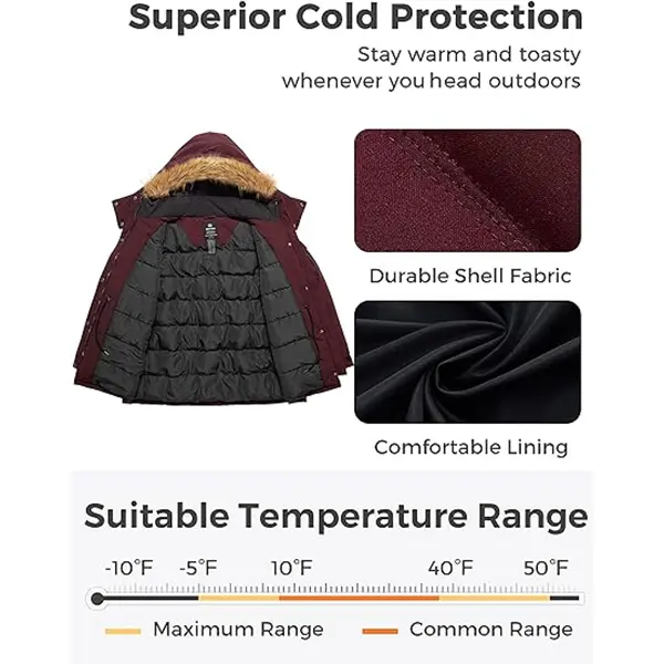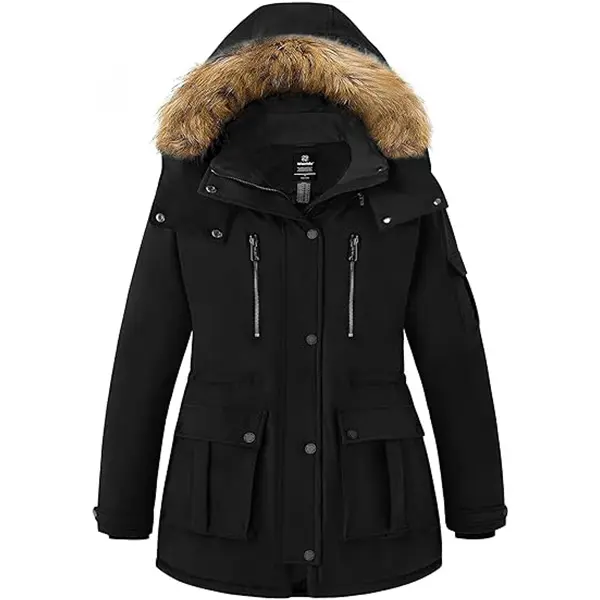 ·A Warm Embrace - Plus size parka jackets for women use soft 240 grams of imitation down cotton padding and skin-friendly pongee liner. This women's warm winter jacket is made with a pure durable shell having a DWR finish and PU membrane, adding an adjustable detachable hood with vegan trim, fleece-lined hand pockets, elastic waist, and snap-button cuffs. Every detail is exquisitely designed to make you enjoy winter.