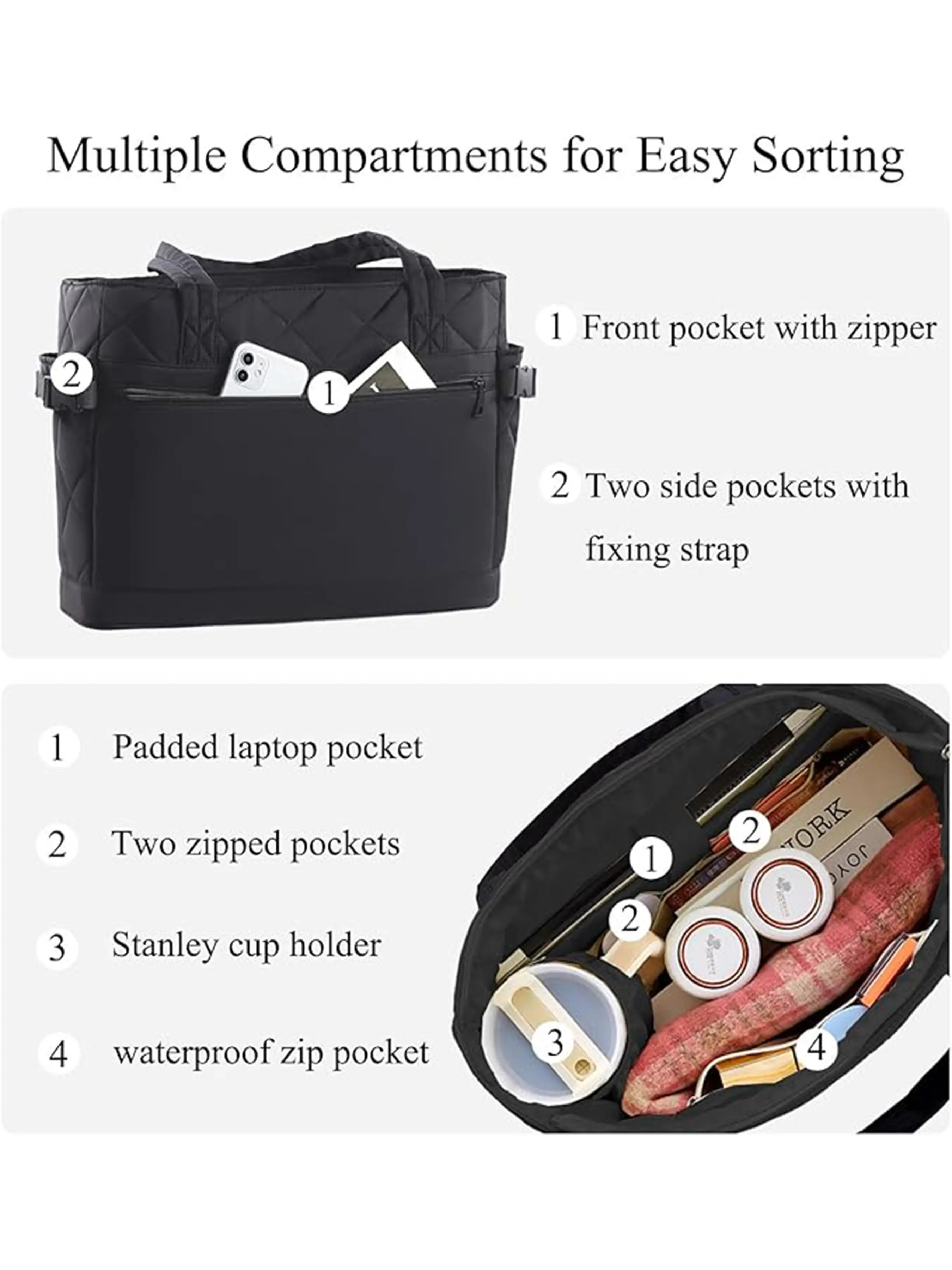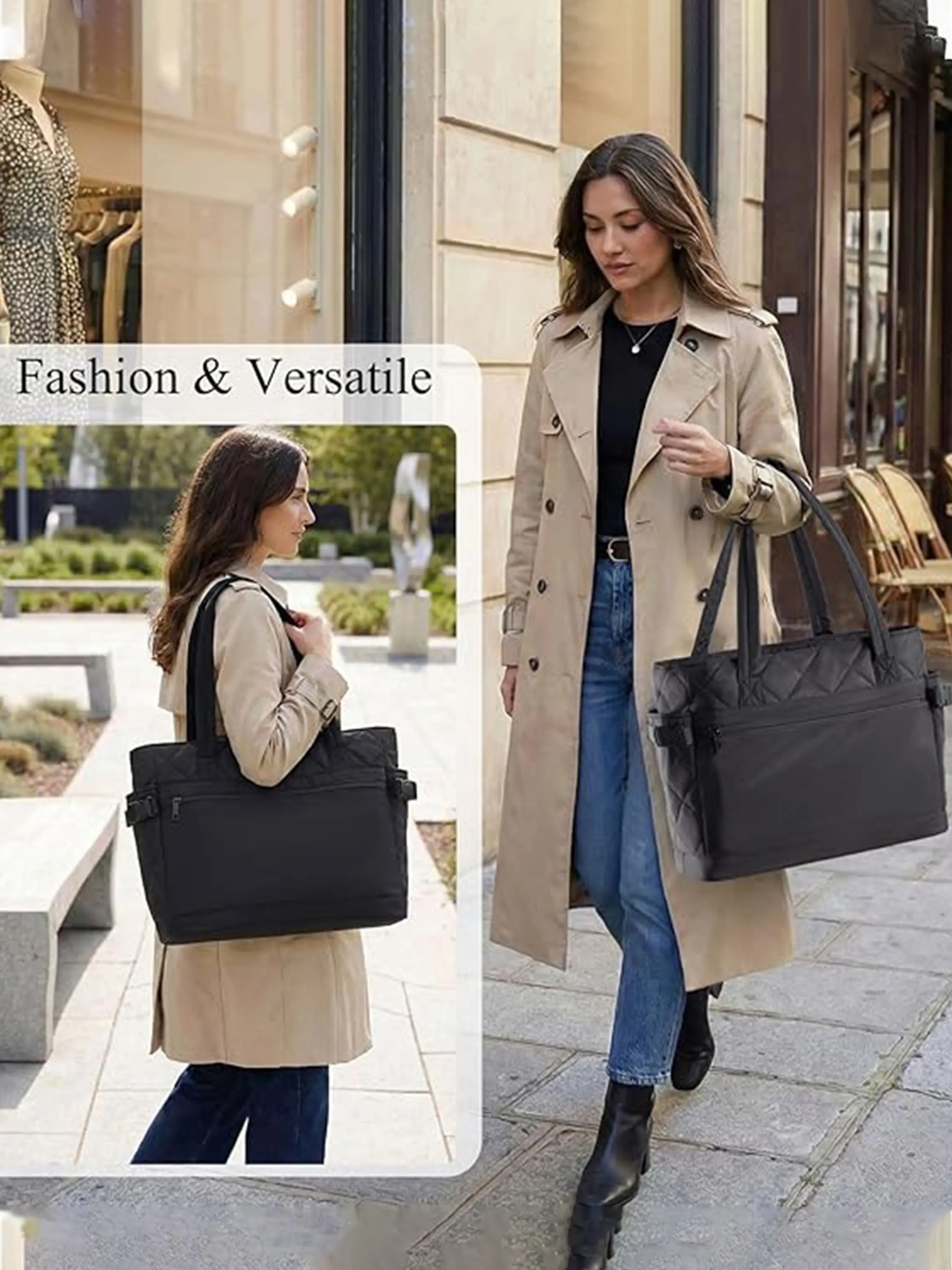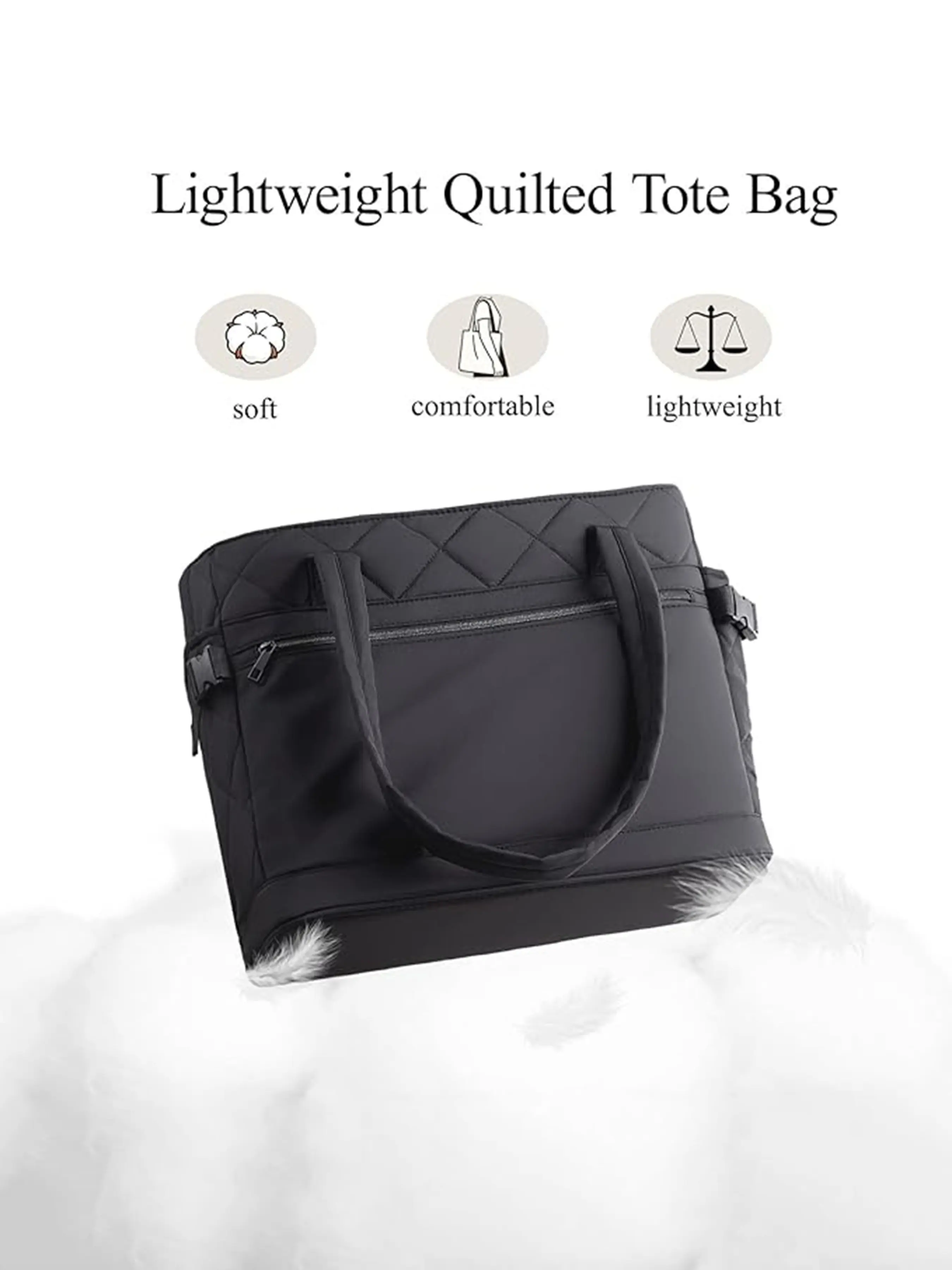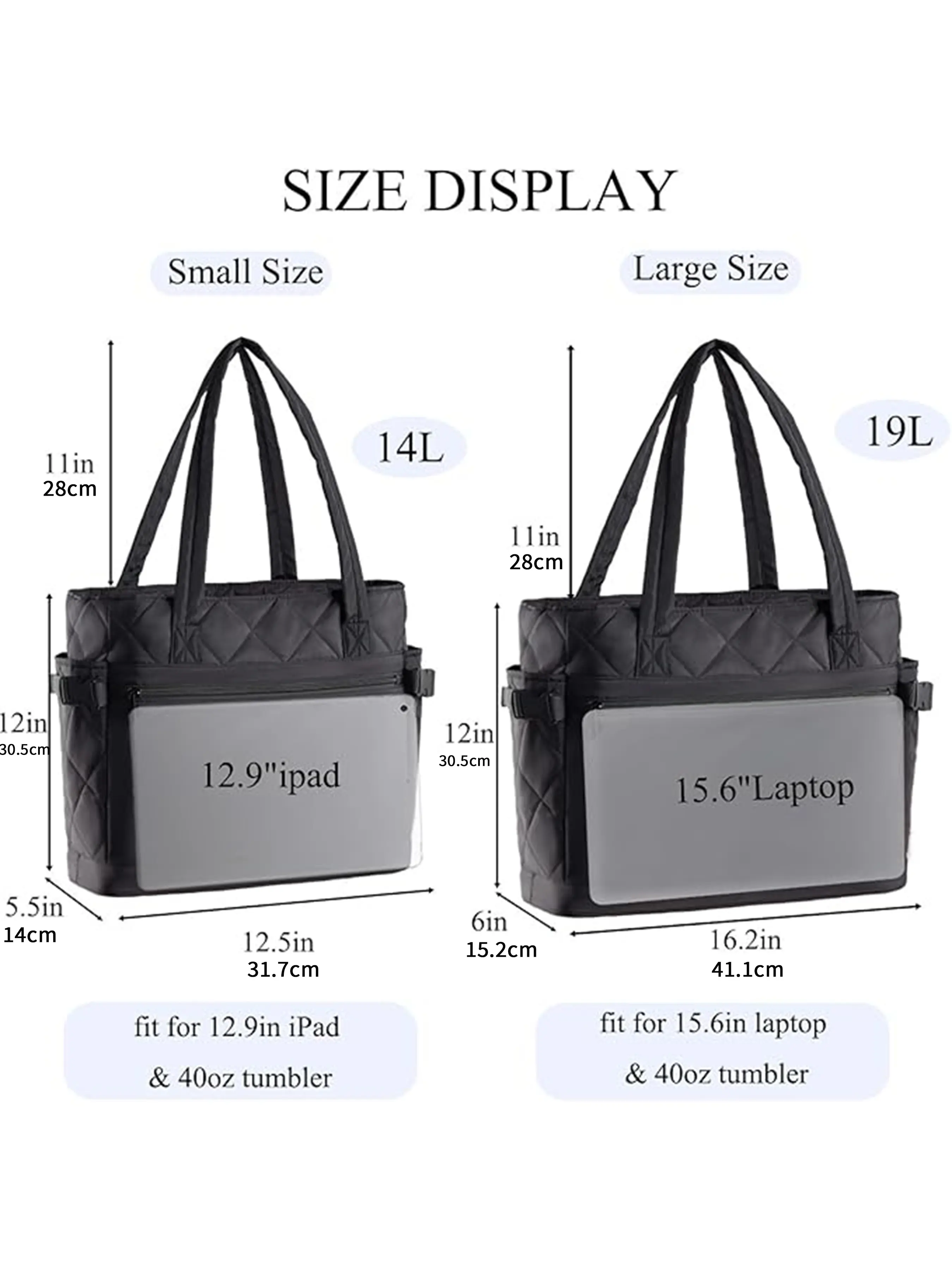 MULTIPLE FUNCTIONAL COMPARTMENTS: Stay organized with this puffer tote bag ( 12.5''L x 5.5''Wx 12''H/16.2''L x6''Wx 12''H) featuring14L/19L capacity with a padded 12.9"/15.6" laptop sleeve, roomy main section, inside zipper pocket, slip pockets, inner cup holder, deep side pockets, anti-theft pockets and large front pockets. Easily store your laptop, books, cosmetics, wallet, phone, headphones, power bank, keys, water bottle and umbrella. Exterior pockets offer quick access while zippered sections add extra security for values