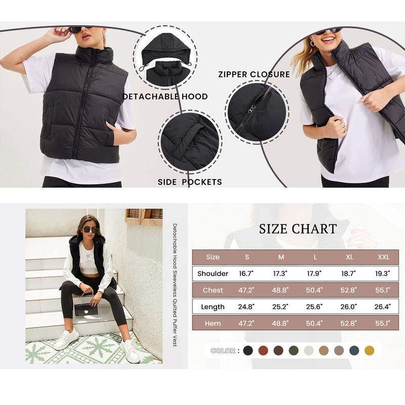 This vest is comfy, I love the color, and the hood is detachable. The down side is the the bottom (around the waist) is too tight when zippered. I really like it so I didn't want to return it but I wish the waist line wasn't tight.