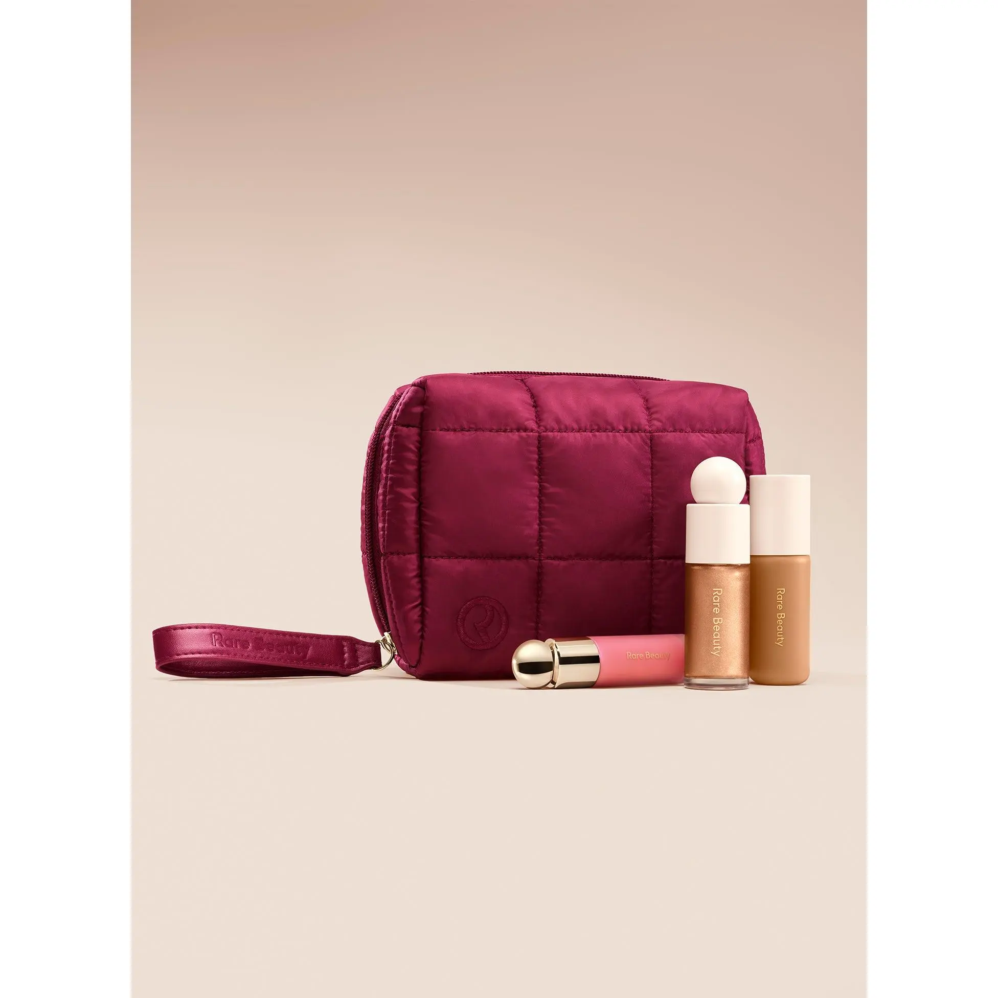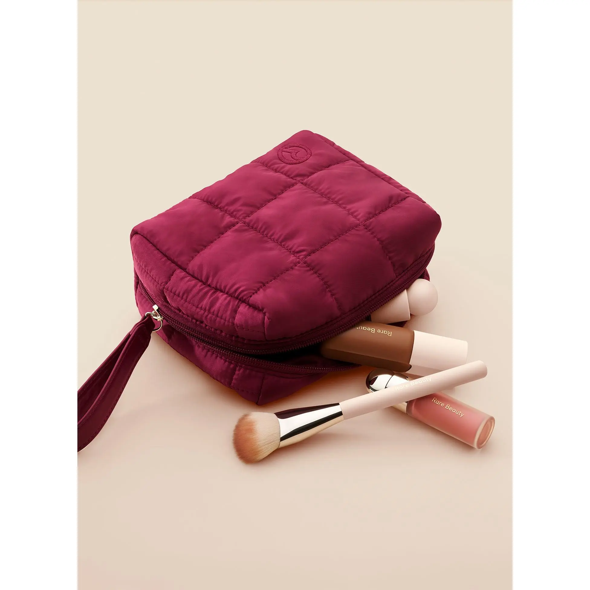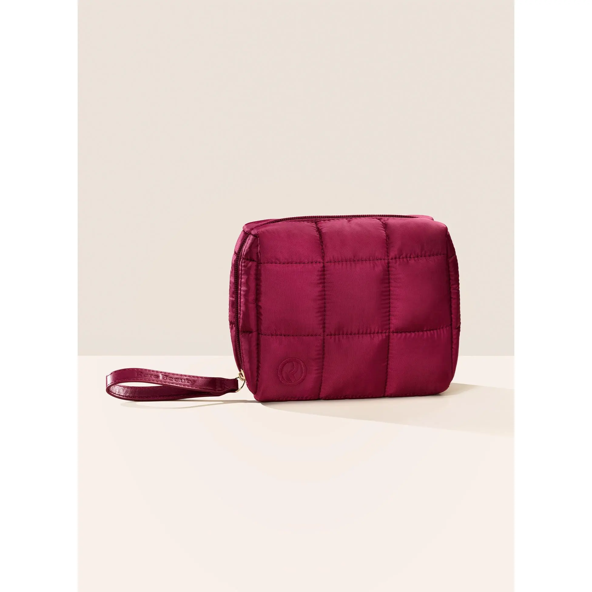 Rare beauty puffy essentials pouch in burgundy color. 2 Free gifts  when you buy the soft pinch blush positive light duo are must have #rarebeauty #puffypouch #makeupbag  #softpinch #makeup #tiktokshopspringglowup #tiktokshopnewarrivals #tiktokshoprestock
