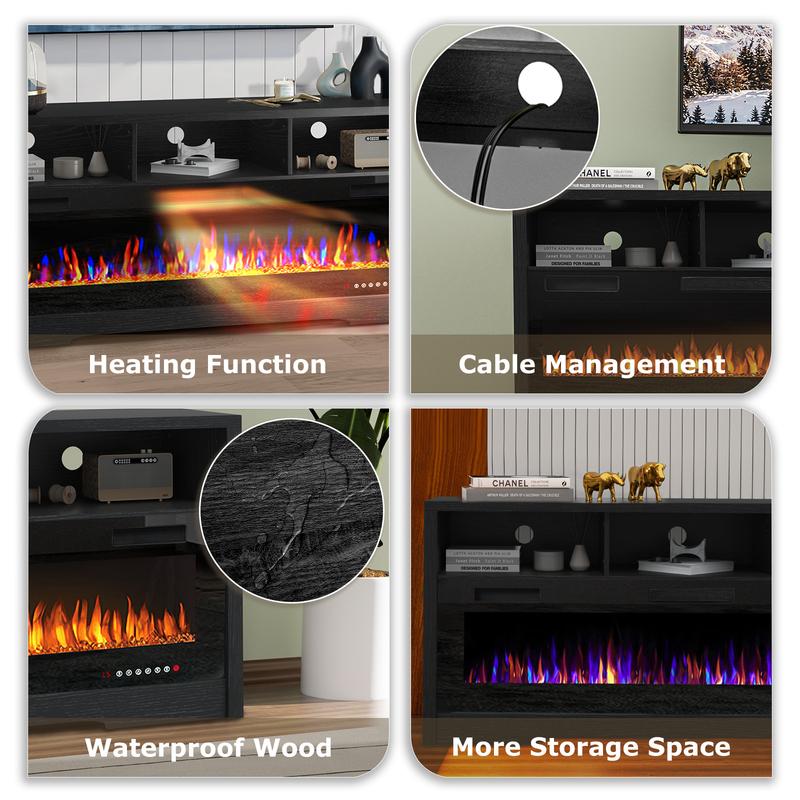 ·【Tv Stand With Fireplace】This fireplace TV stand combines a 63.3" L × 15.8" W × 28.3" H TV stand with an 60" electric fireplace, making this TV stand a versatile home entertainment center.A wide Fireplace TV stand with cabinets is made of sturdy material, which can hold up to 75" TVs.