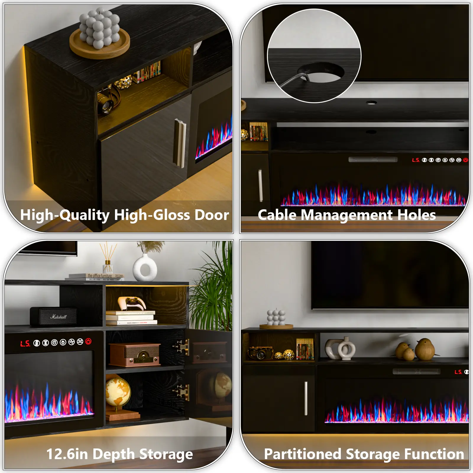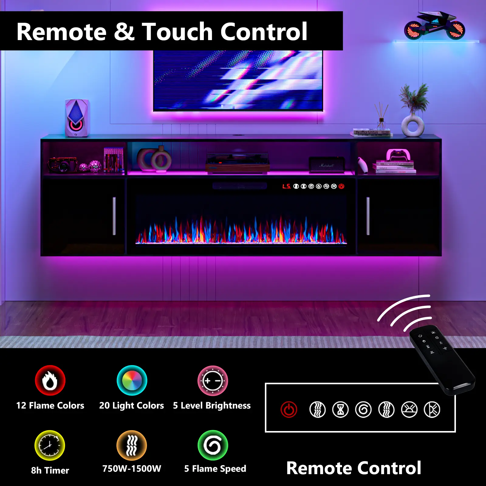 ·36IN Fireplace: This fireplace for the living room TV stand includes 12 flame colors, 5 brightness options to meet your different needs, you can choose to keep one of the colors or show 12 colors in sequence. Flame effect and heating work are independent of each other. The temperature can be set from 62°F to 82°F. Can adjust to 750W or 1200W depending on your room temperature, and can heat rooms up to 400 square feet.