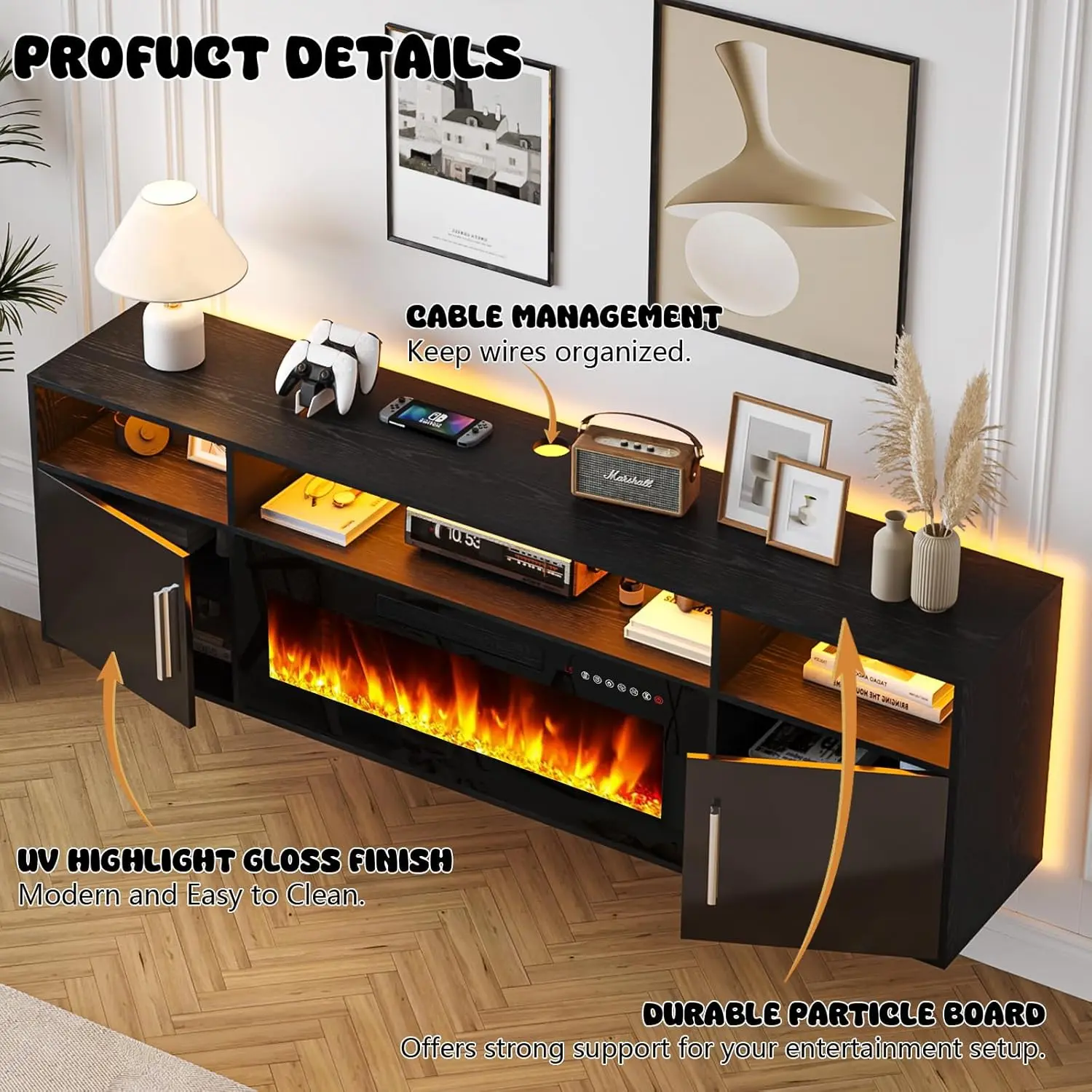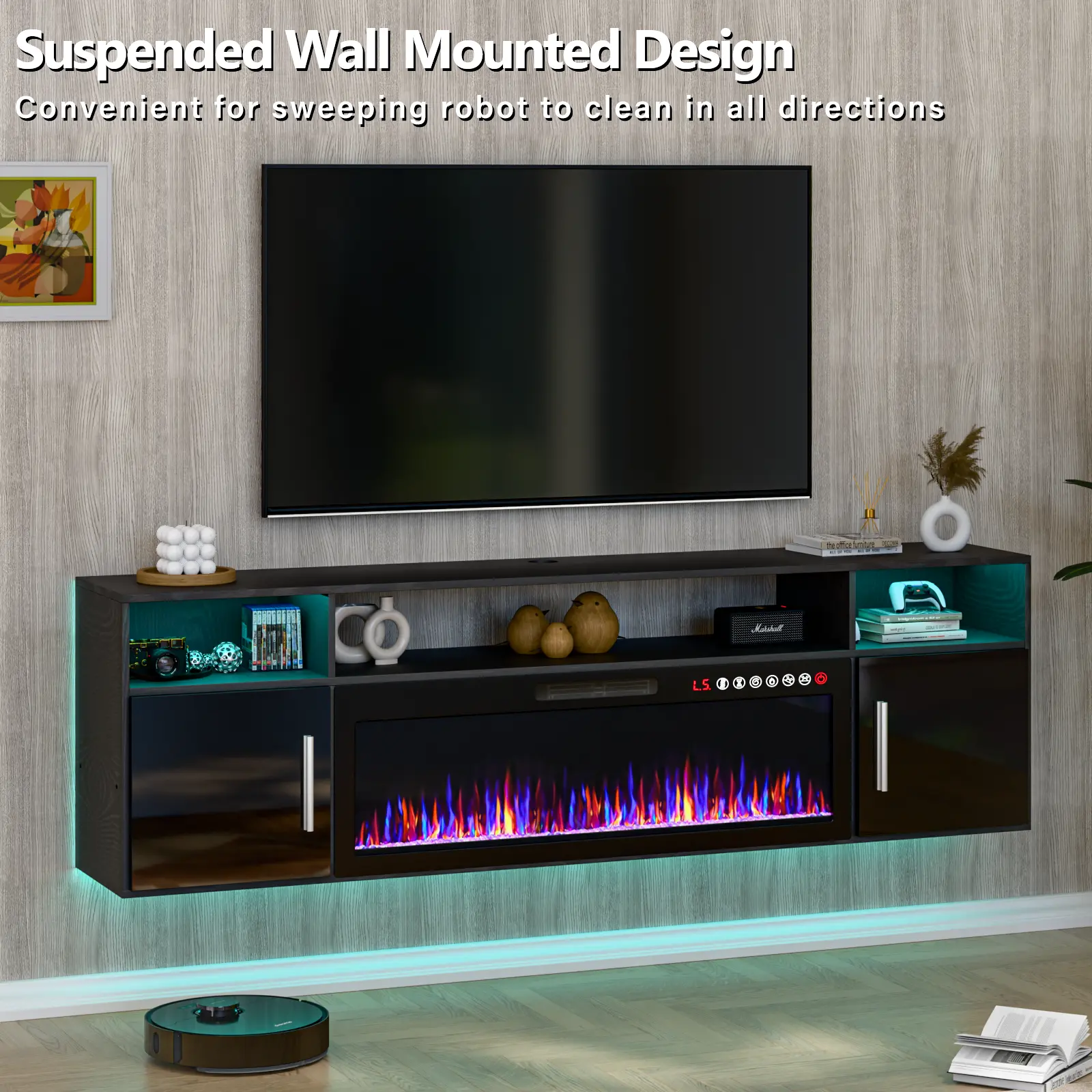 ·Unique Floating 2-In-1 Design: This fireplace TV stand combines a 70-inch floating TV cabinet with a 36-inch mirrored electric fireplace, making this TV cabinet a multifunctional home entertainment center. The furniture is made of engineered wood with waterproof paint on the surface, which has good water resistance and is easy to clean. The sturdy structure ensures the strong support ability of the TV cabinet to maintain a long service life.The height of the cabinet hanging on the wall can be adjusted at will.