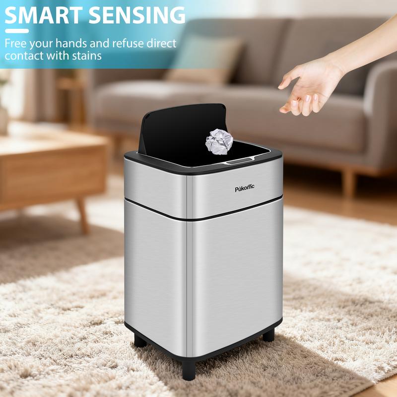 The Pukomc 2.7Gal Smart Bin is an auto-opening stainless steel trash can, perfect for kitchens, bathrooms, and offices. Its sleek design ensures a modern look fits seamlessly into any space. The bin's hands-free operation provides convenience without compromising on style. Ideal for maintaining cleanliness and order.