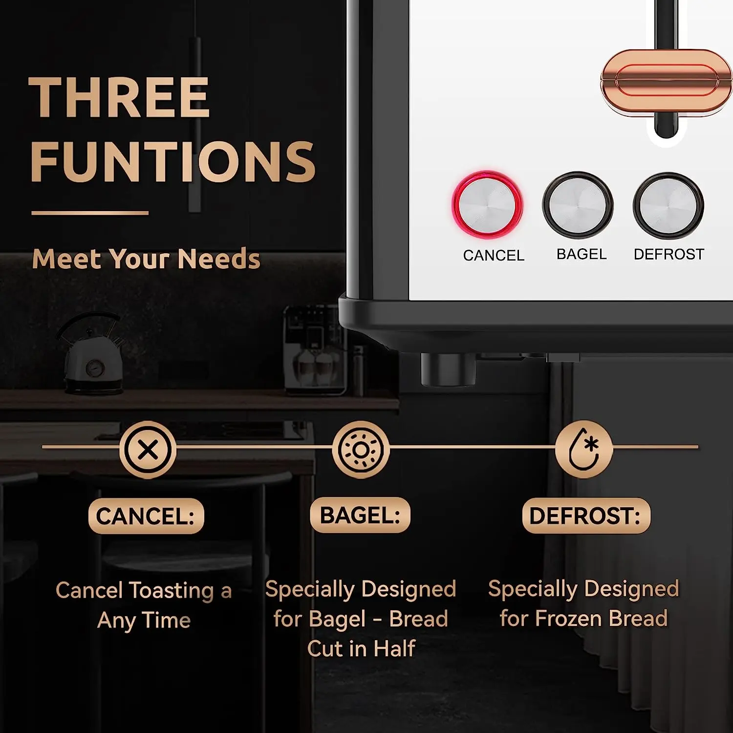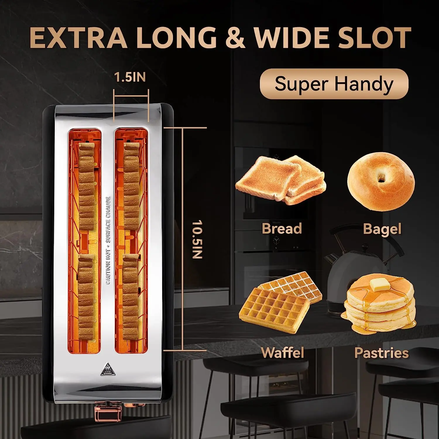 ·【EXTRA LONG&WIDE SLOT】– With 10.5" long and 1.5" wide Slot you can toasting 4 slices of bread at once, fit long, thick slices of bread, Texas toast, bagels, English muffins, the long shape saves counter space in the kitchen and blends in well with appliances.