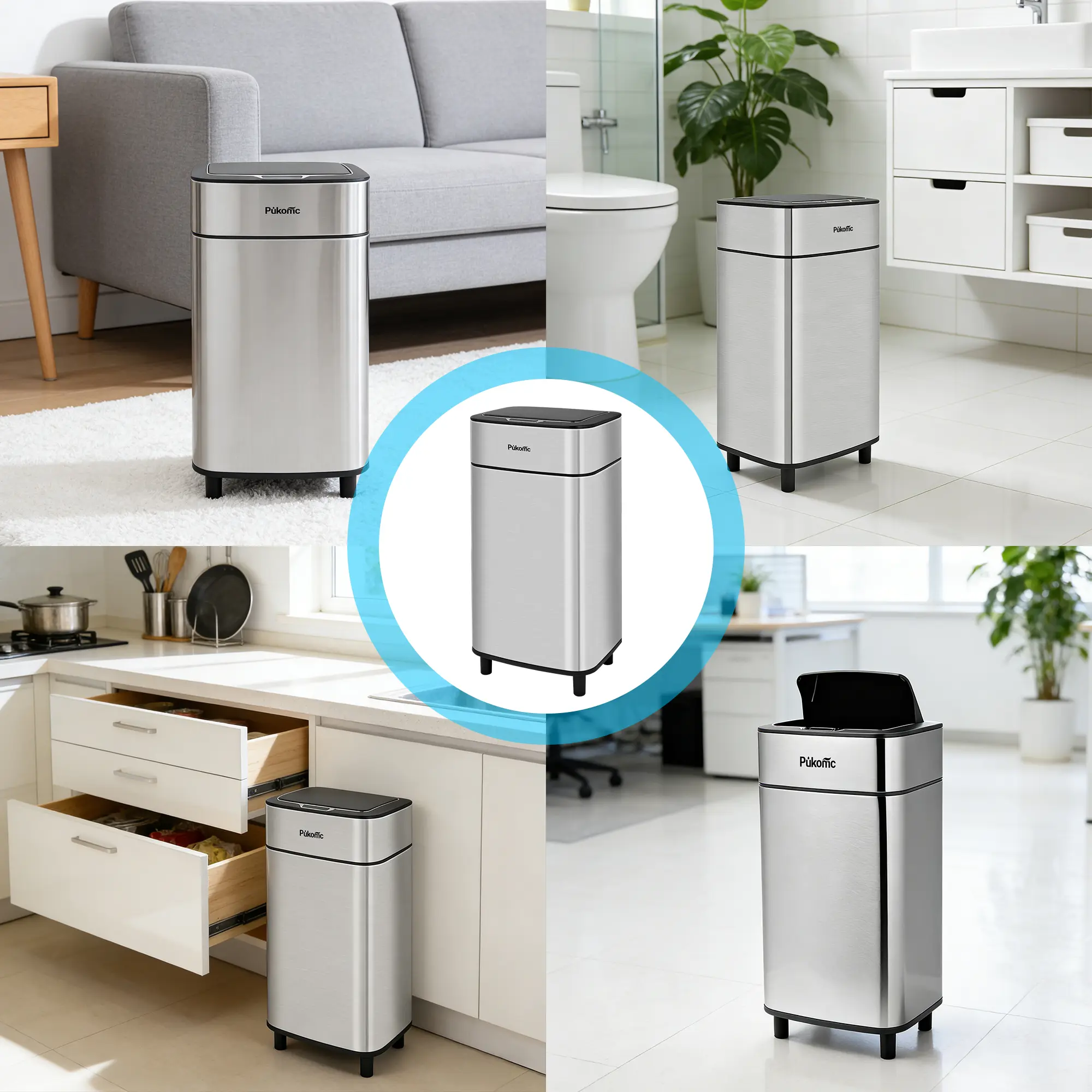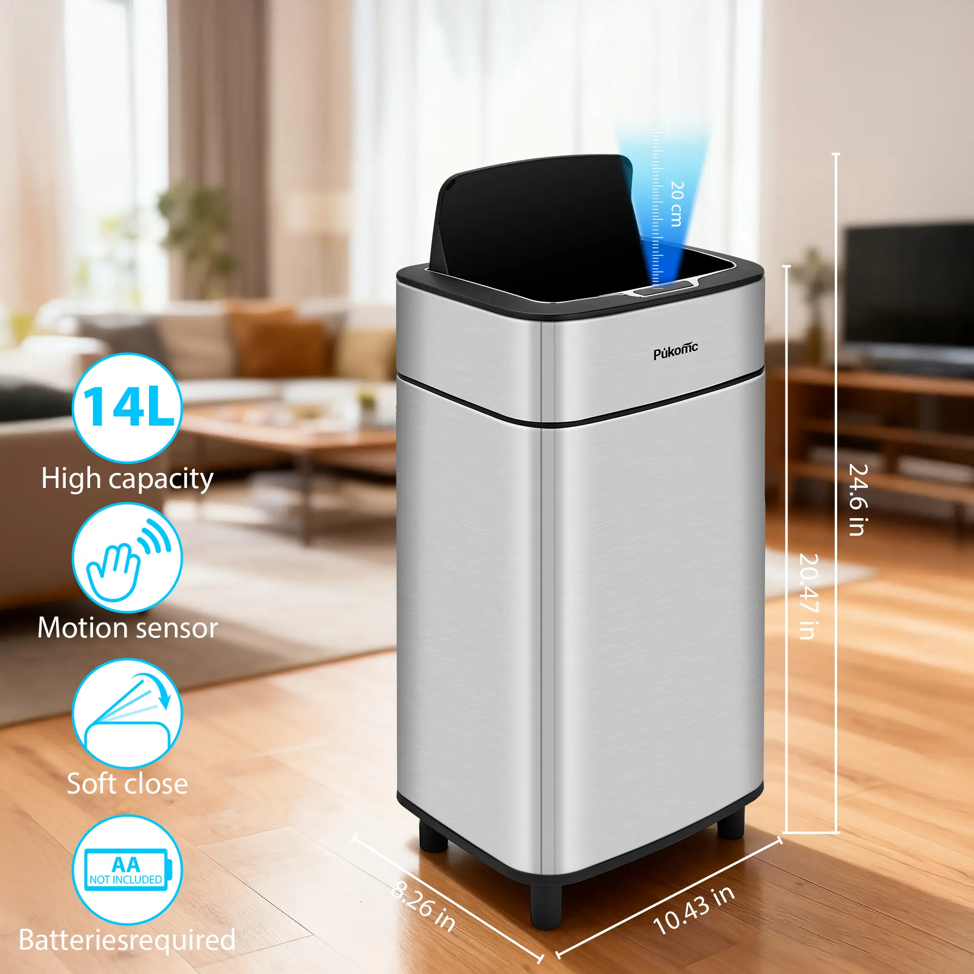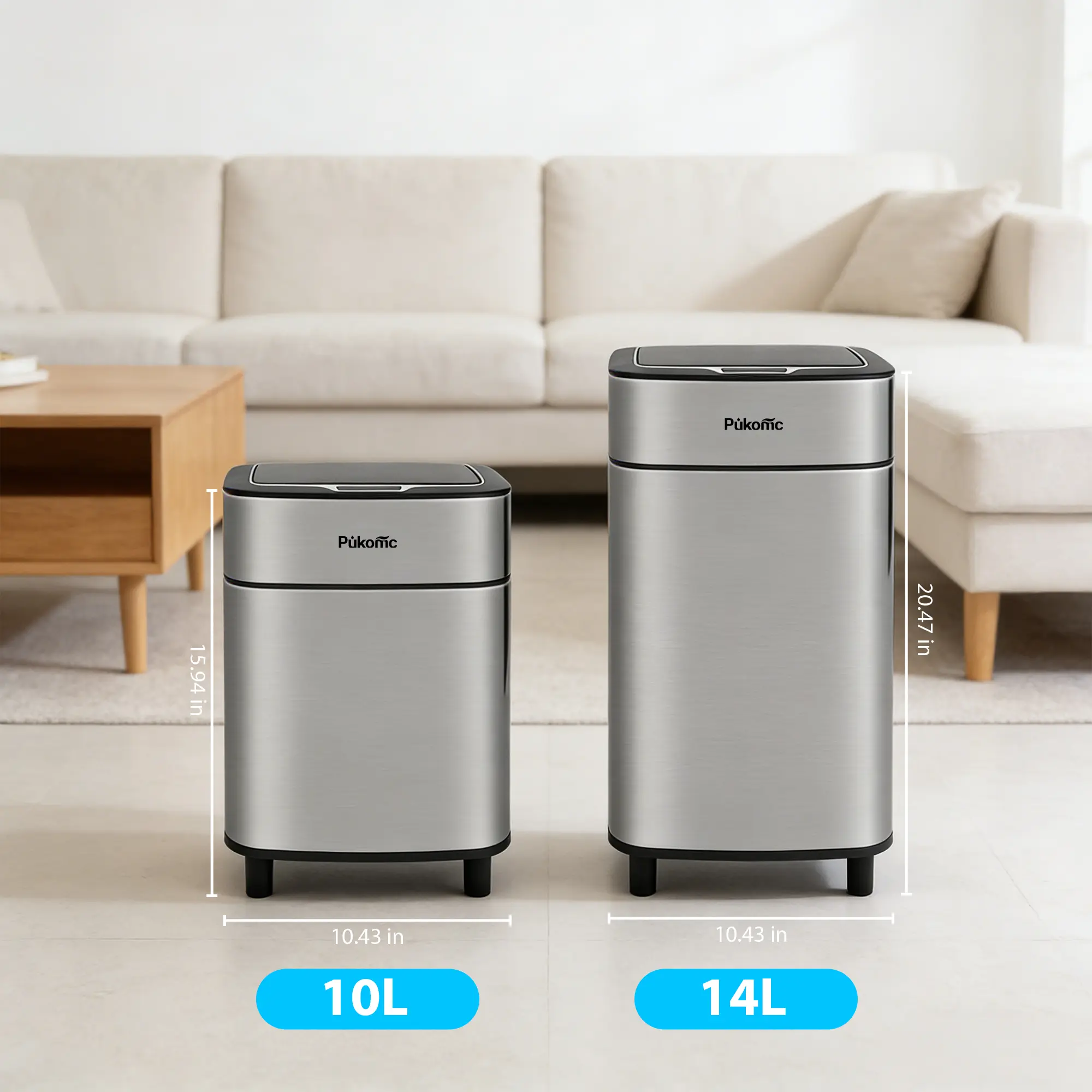 The Pukomc sensor bin measures 16 in tall, 8.3 in wide, and 10.6 in deep. It's a 10L bin, perfect for kitchens, bathrooms, and offices. Its slim rectangular design saves space while providing ample storage. This bin is an essential addition to any home or workspace.