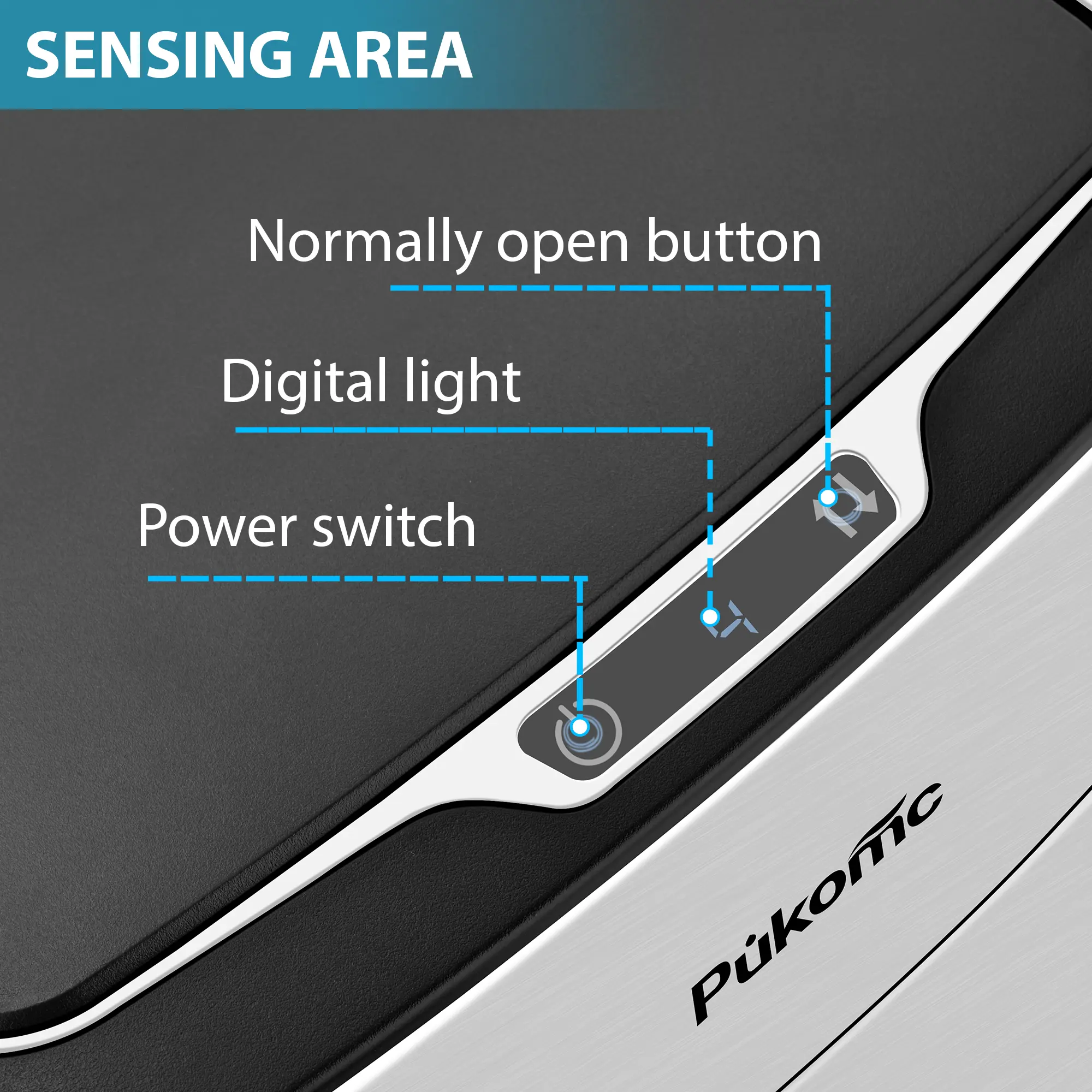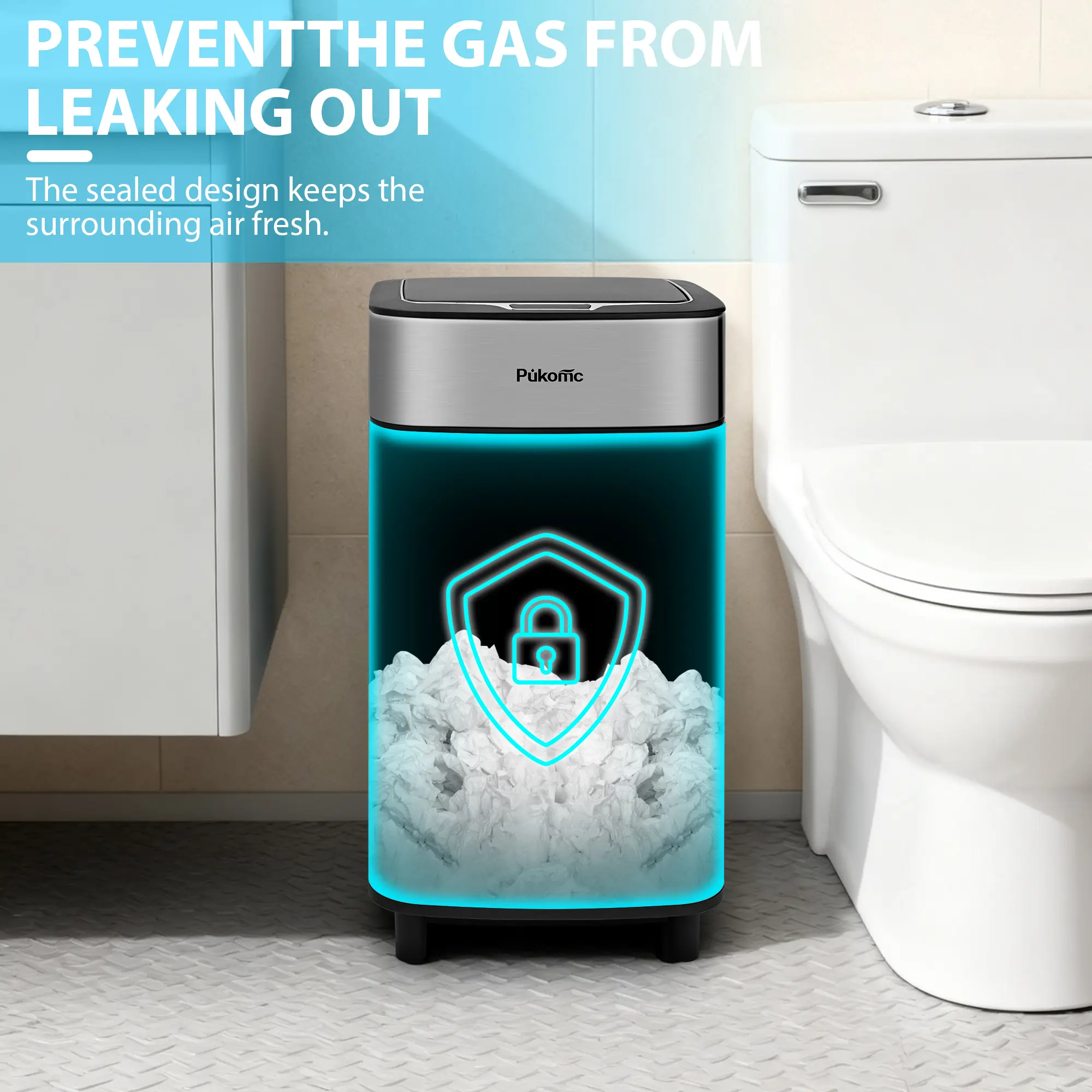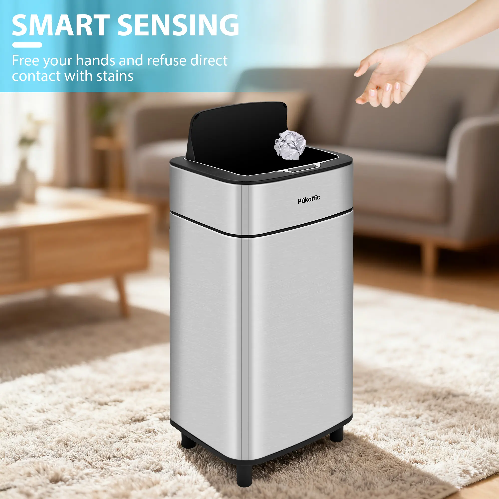 The Pukomc sensor bin measures 16 in tall, 8.3 in wide, and 10.6 in deep. It's a 10L bin, perfect for kitchens, bathrooms, and offices. Its slim rectangular design saves space while providing ample storage. This bin is an essential addition to any home or workspace.