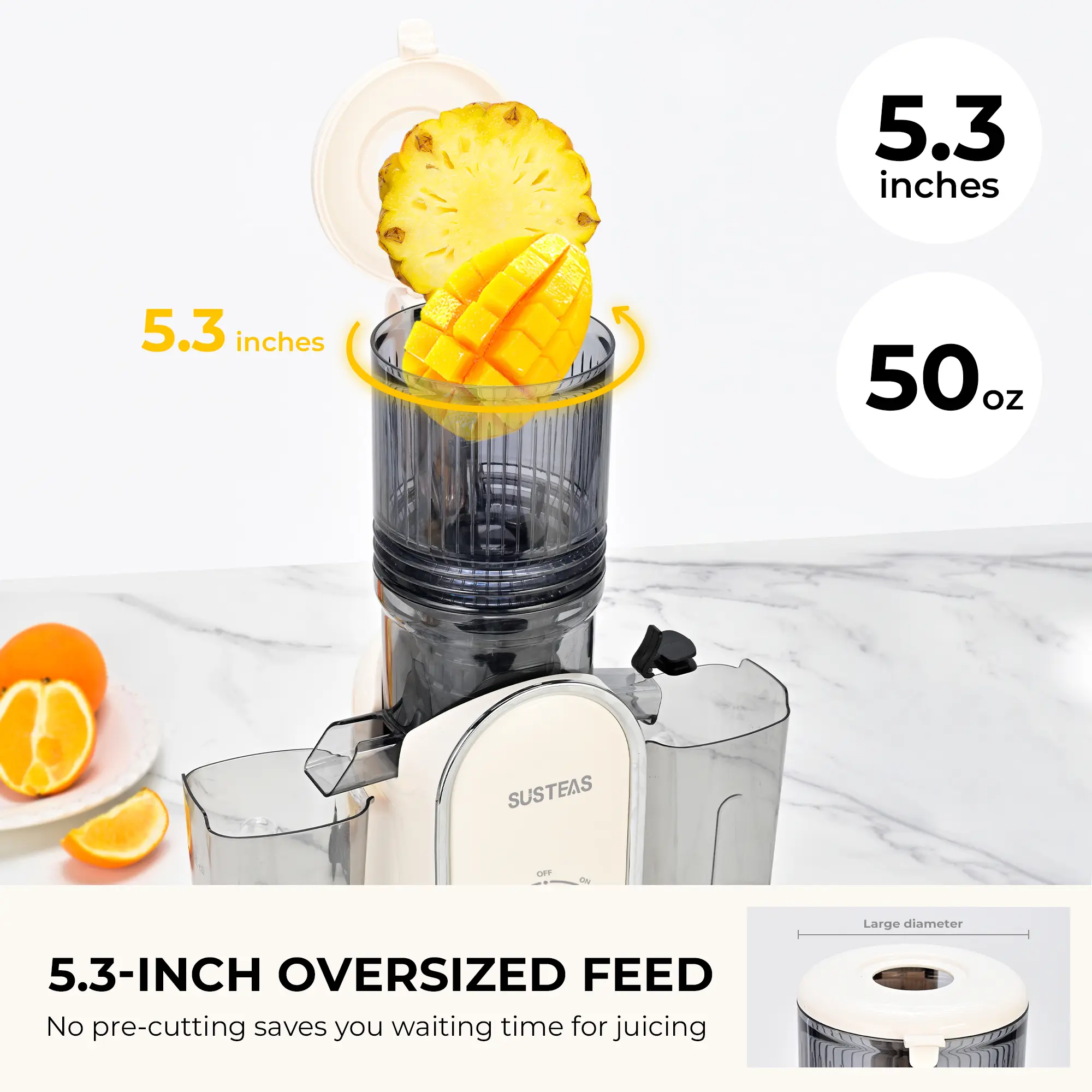 【Supports whole fruit juicing】:Say goodbye to the hassle of preparing fruits and vegetables with cold press juicer. Its 5.3" extra-large feed chute allows you to insert whole pieces with ease.
