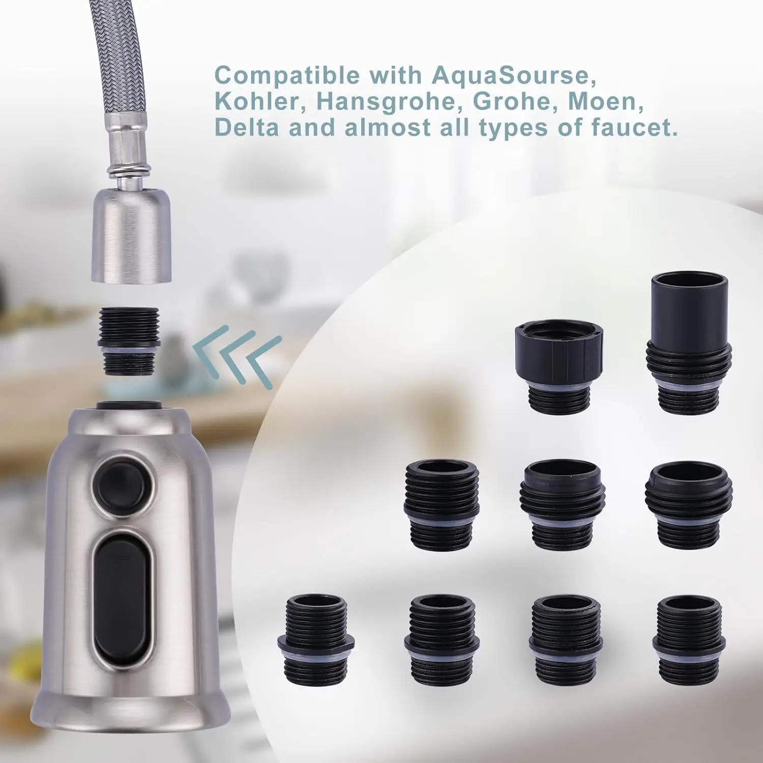 【 Faucet Adapters】This faucet comes with 9 adapters, compatible with standard faucets,included but not limited to Moen, AquaSource, Kohler, Hansgrohe and Grohe.