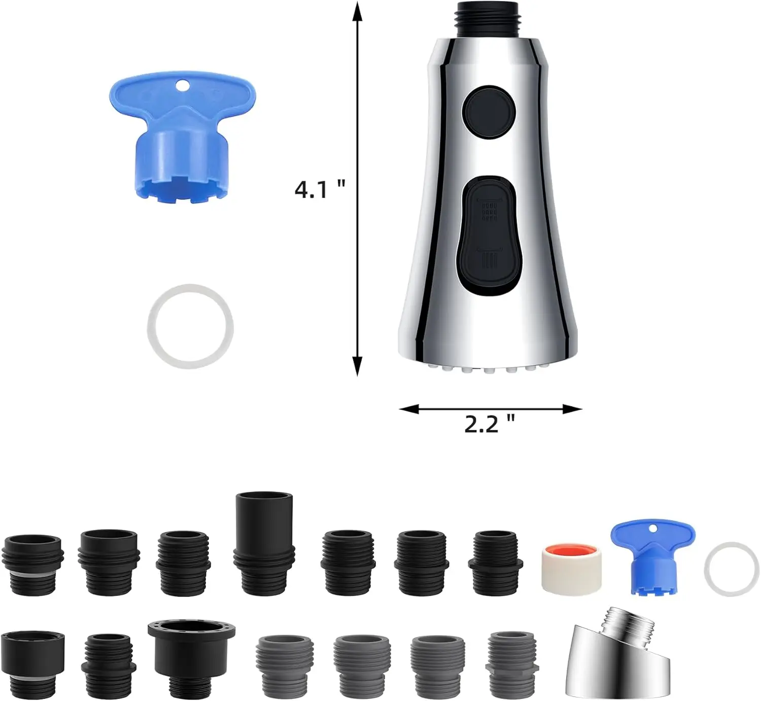 In 15 Connection Sizes: chrome faucet spray replacement comes with 15 adapters for various connections; It is not limited to compatible with Standard, Moen, Delta, AquaSource, Kohler, Hansgrohe and Grohe (Pfister or Glacier not included).Please confirm your faucet type before purchase and measure your faucet thread size in advance