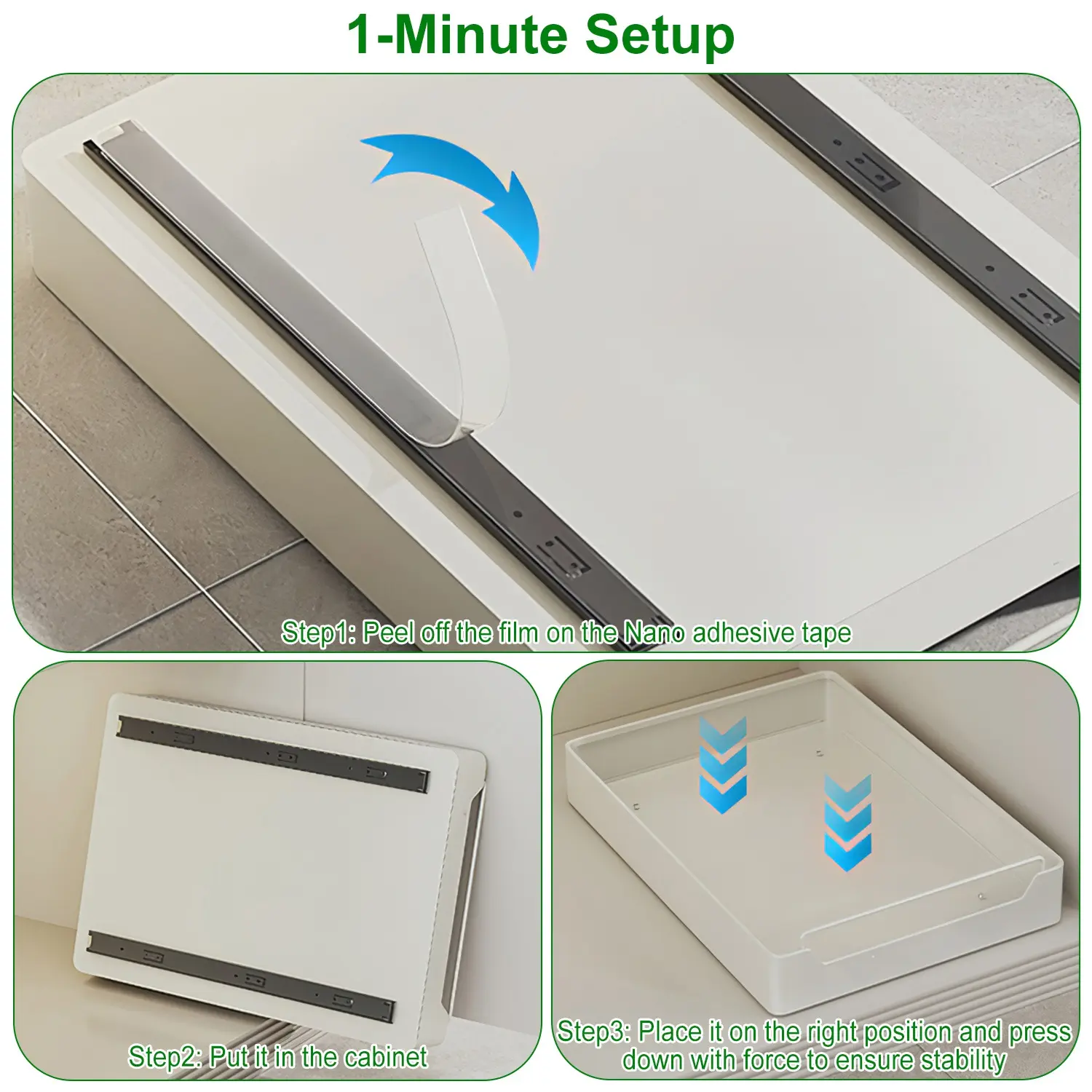 Renters friendly! No drills, no screws, and no damaged cabinets. Our innovative drawers use industrial-grade nano adhesive tape. Simply peel off the protective film, stick it to the bottom of your cabinet, and it's securely locked in place in under 60 seconds!