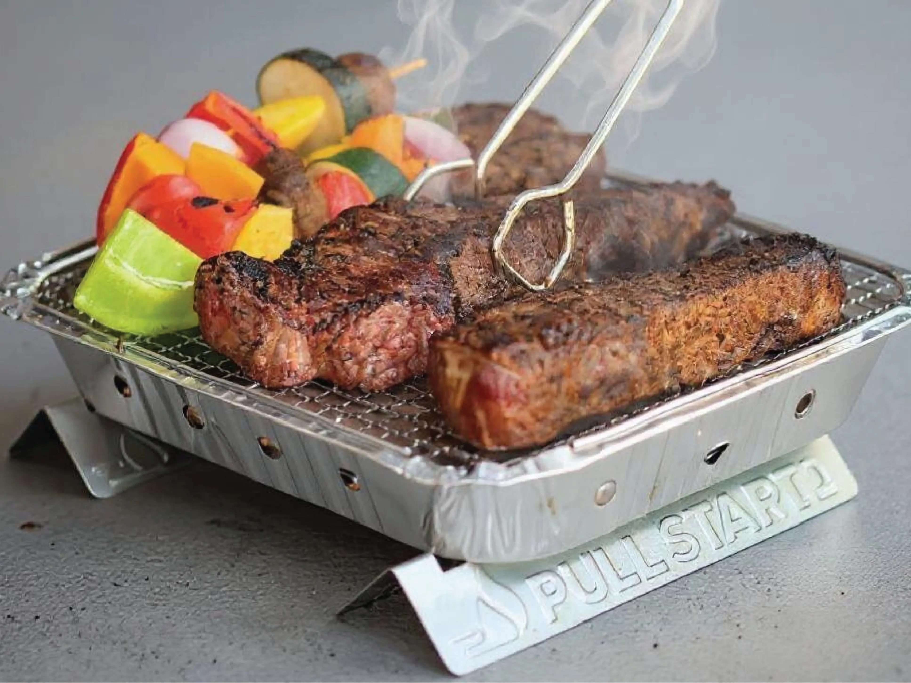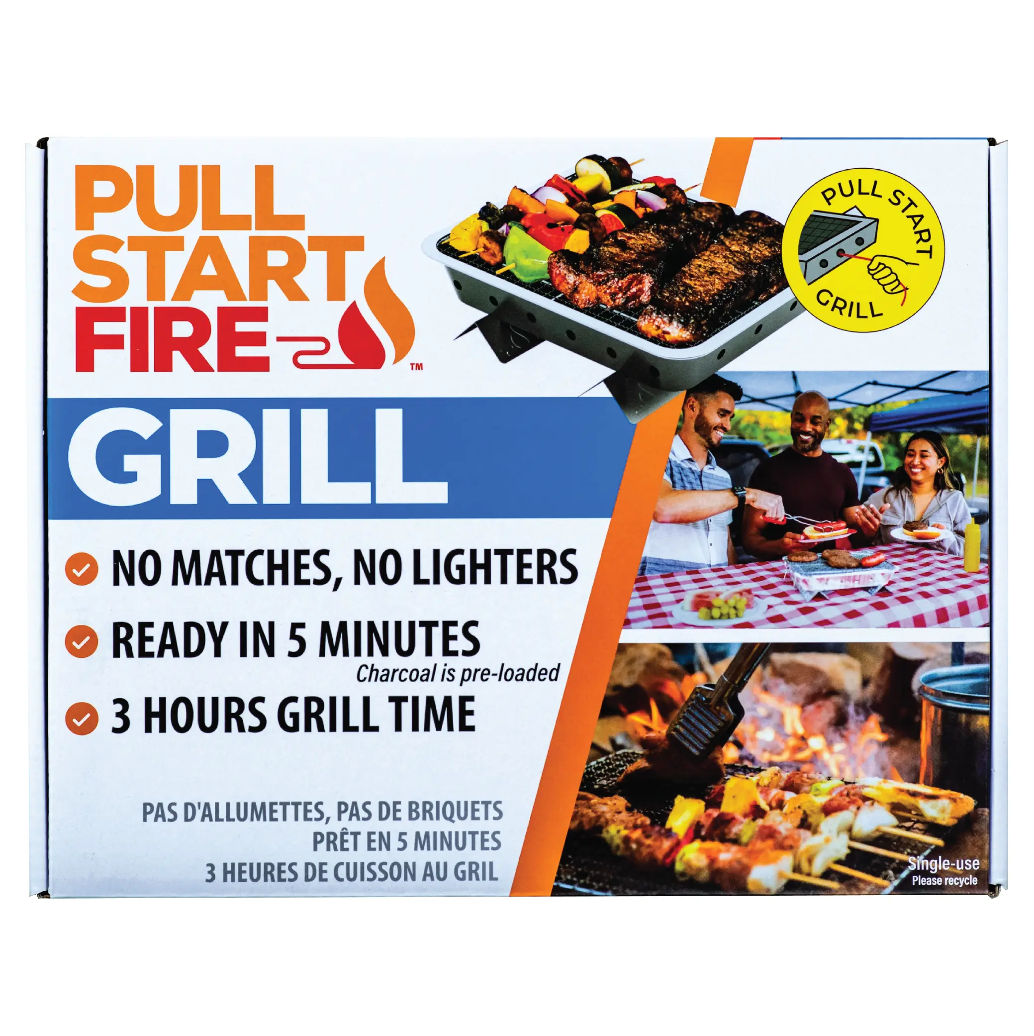 The Pull Start Fire Grill is a revolutionary portable, disposable grill powered by our patented matchless firestarter technology and a pre-loaded solid charcoal brick. Pull the string to light and your grill will be ready to go in 5 minutes—no kindling, no gas, no trouble.